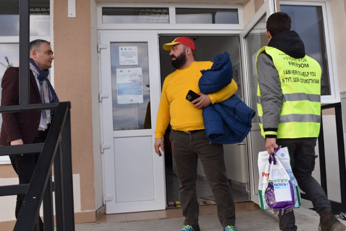 Constantin Acsinte, viceprimarul orașului Darabani, îl însoțește pe prefect la un spațiu de cazare temporar al refugiaților.