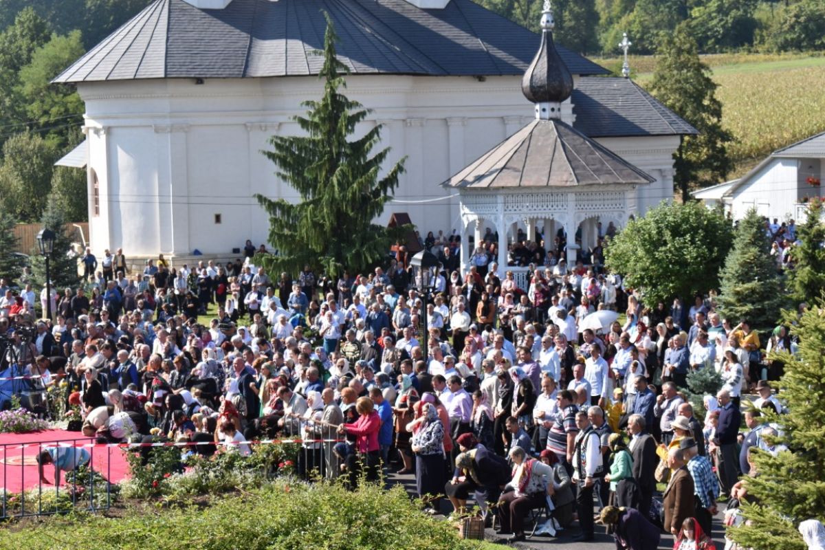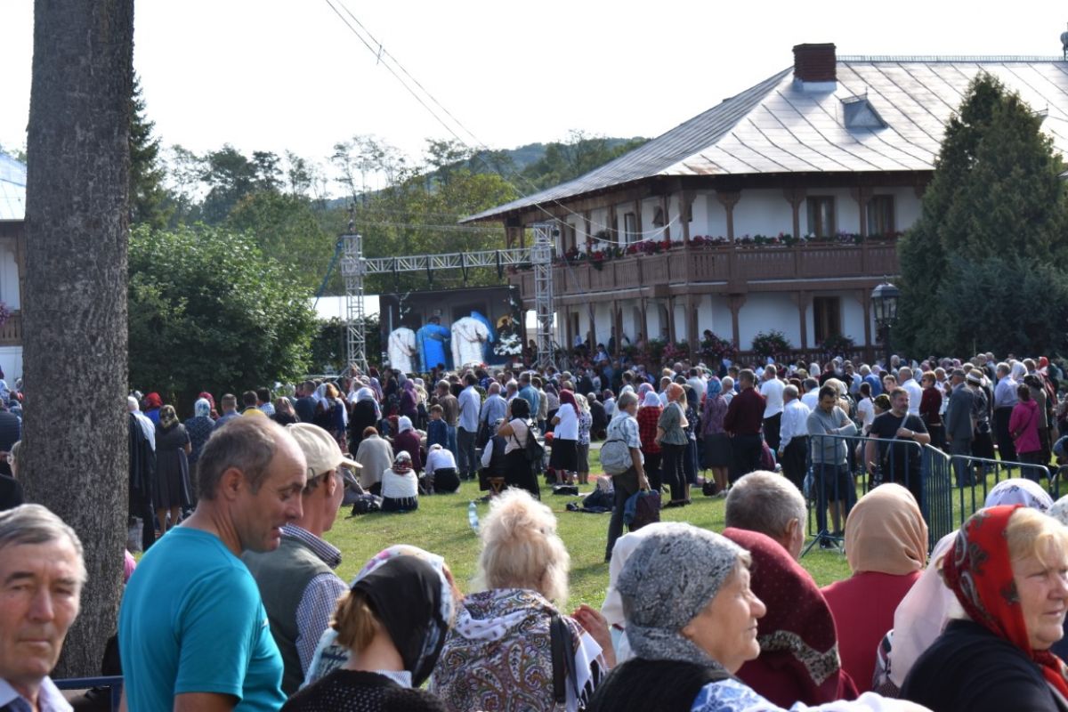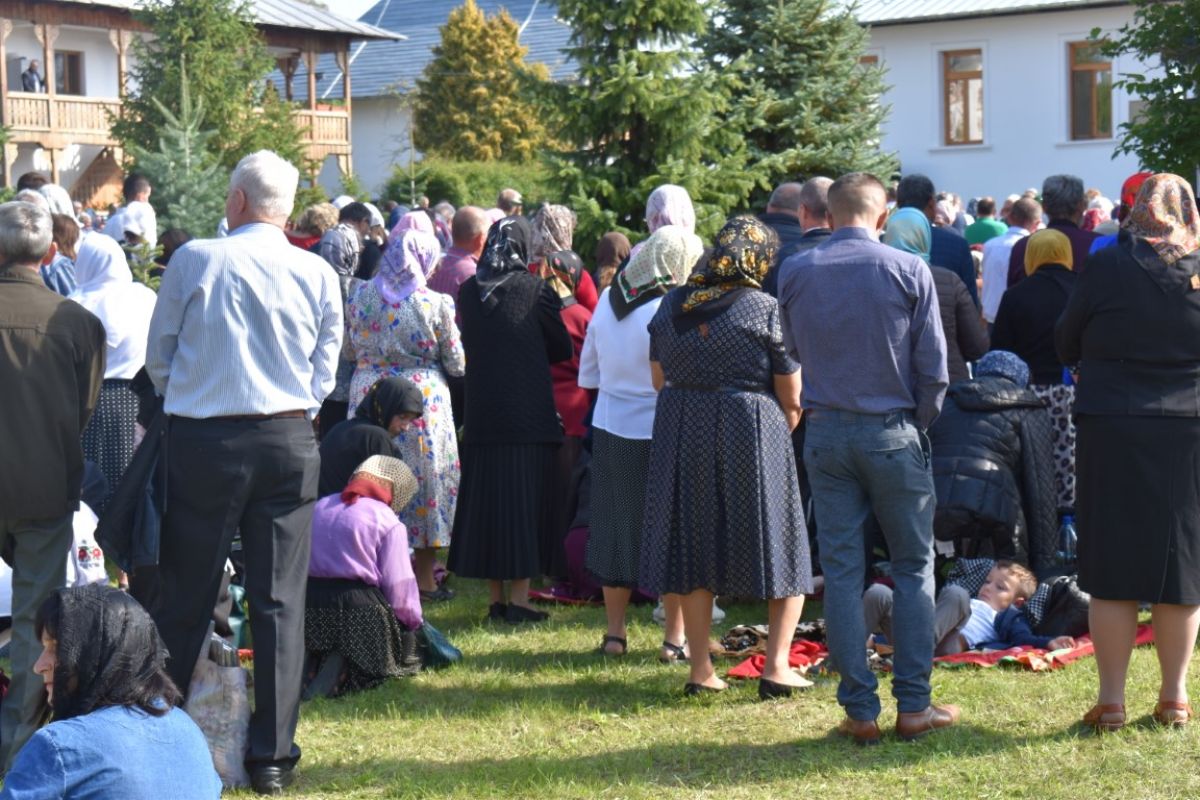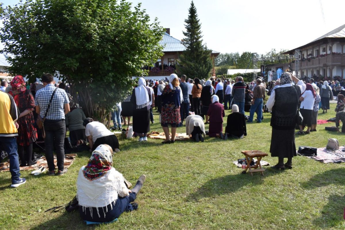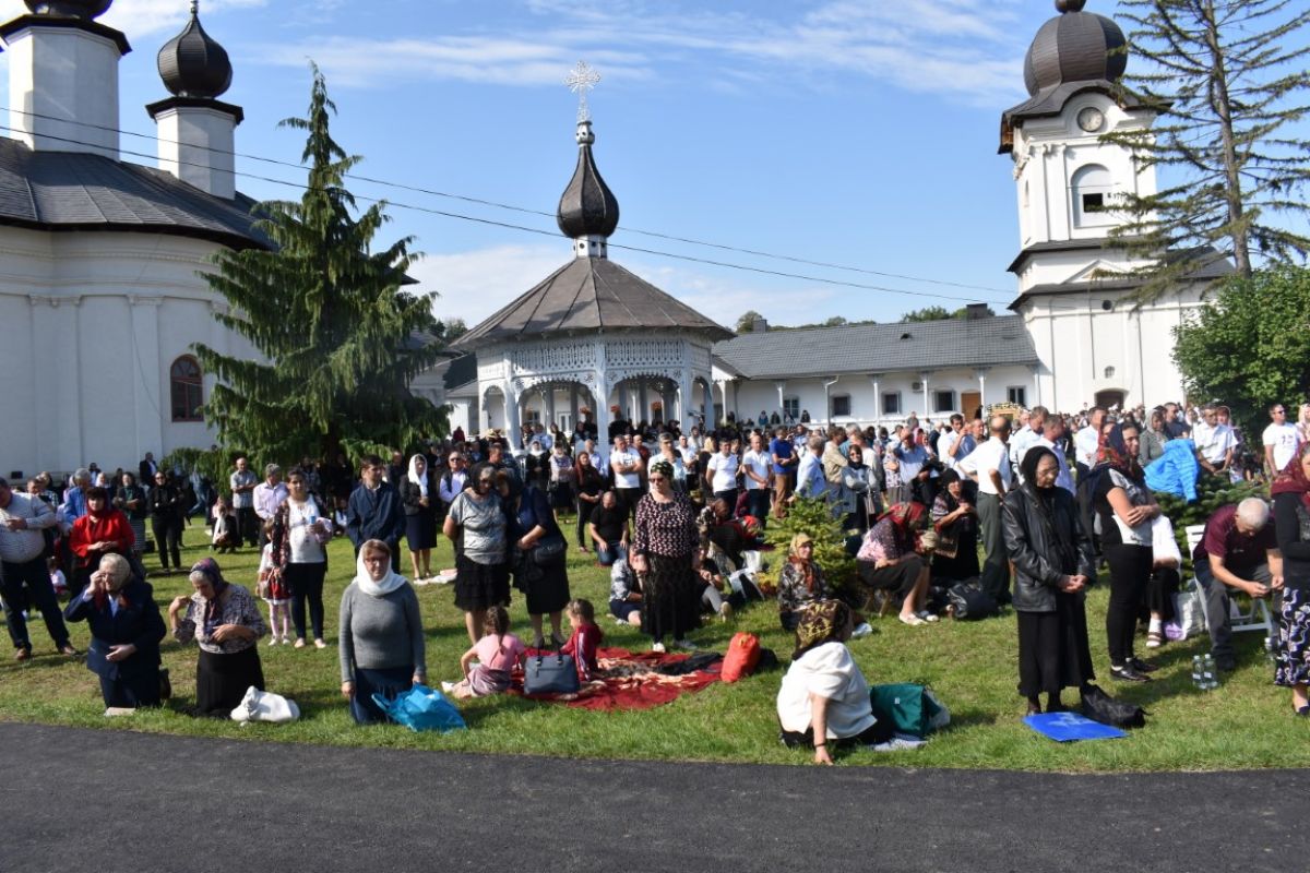 În interior, o mare de credincioși era răsfirată pe iarba din curtea Mănăstirii. Îmbrăcați în straie populare mulți dintre ei, cu copii în brațe sau lăsați să se joace pe pături. Oameni cu capul plecat într-o rugăciune tăcută sau în genunchi, atenți la slujba oficiată sus pe treptele clădirii principale.