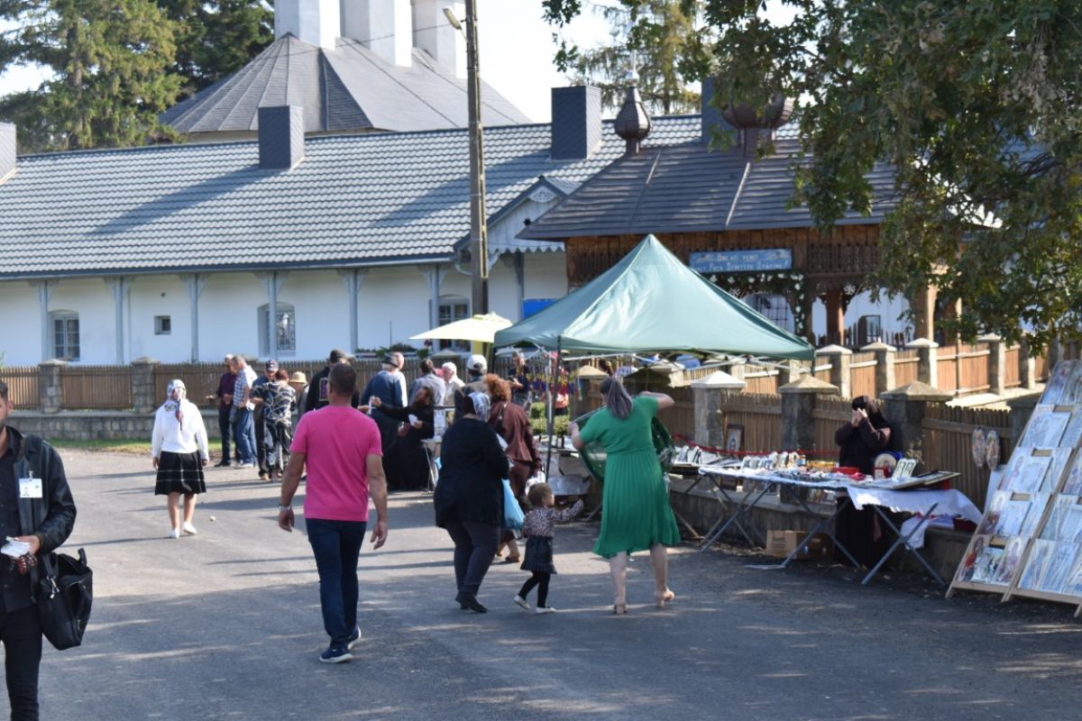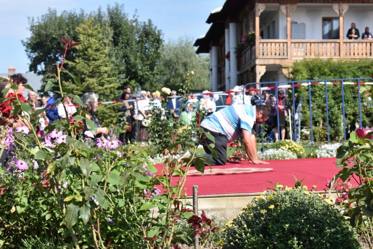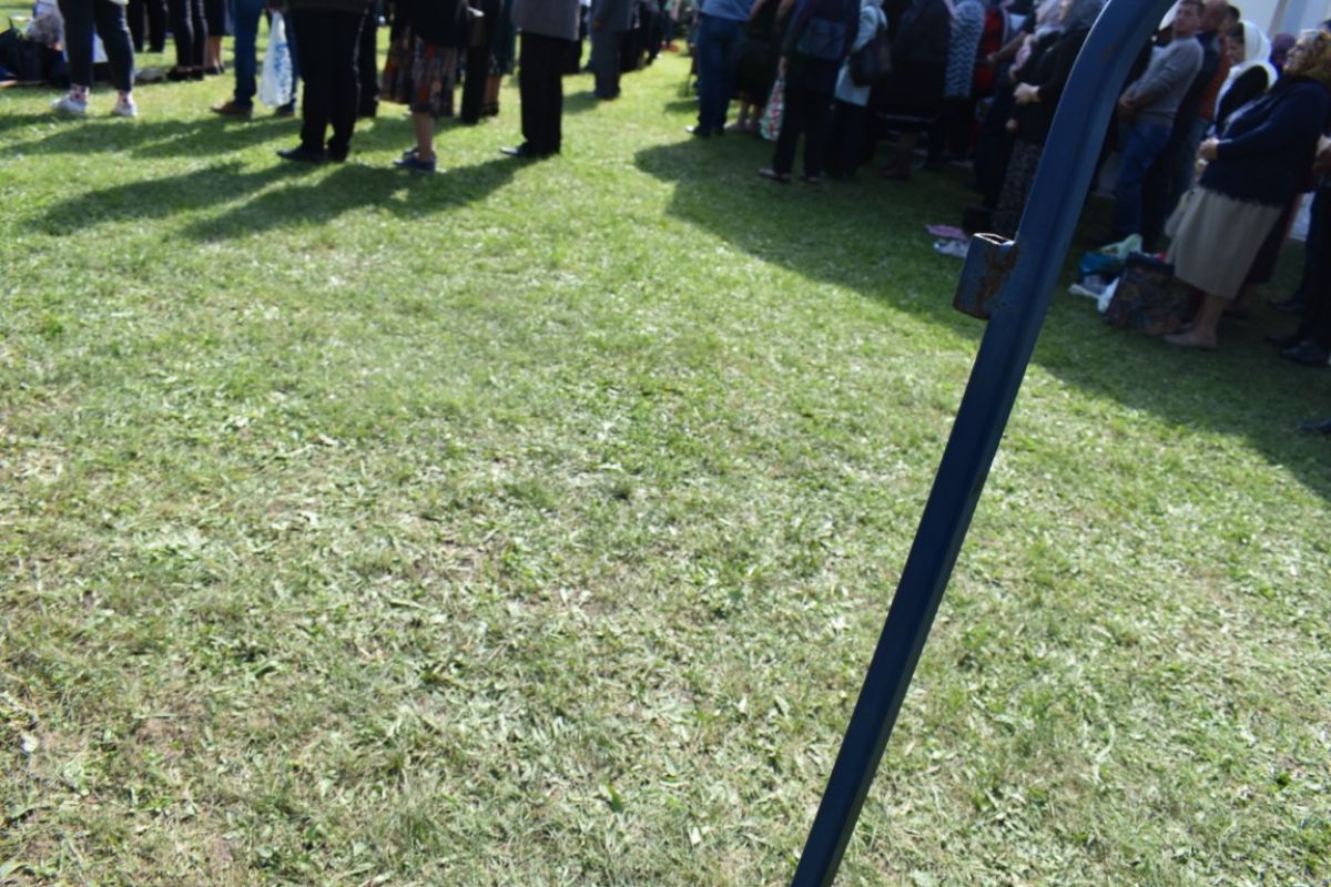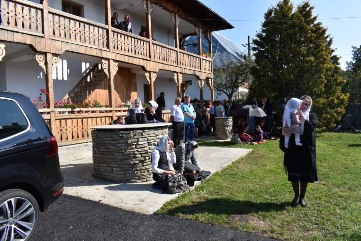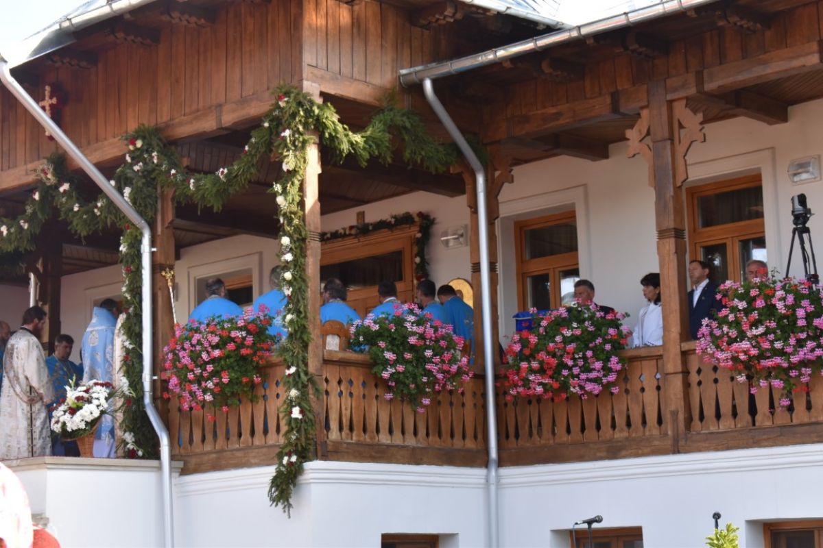 În interior, o mare de credincioși era răsfirată pe iarba din curtea Mănăstirii. Îmbrăcați în straie populare mulți dintre ei, cu copii în brațe sau lăsați să se joace pe pături. Oameni cu capul plecat într-o rugăciune tăcută sau în genunchi, atenți la slujba oficiată sus pe treptele clădirii principale.