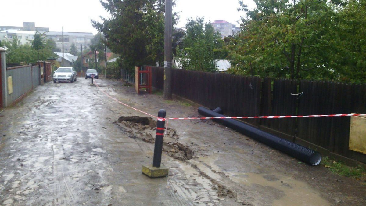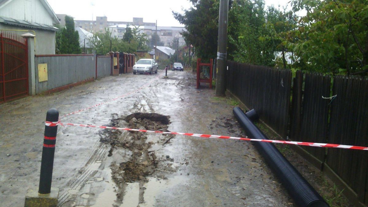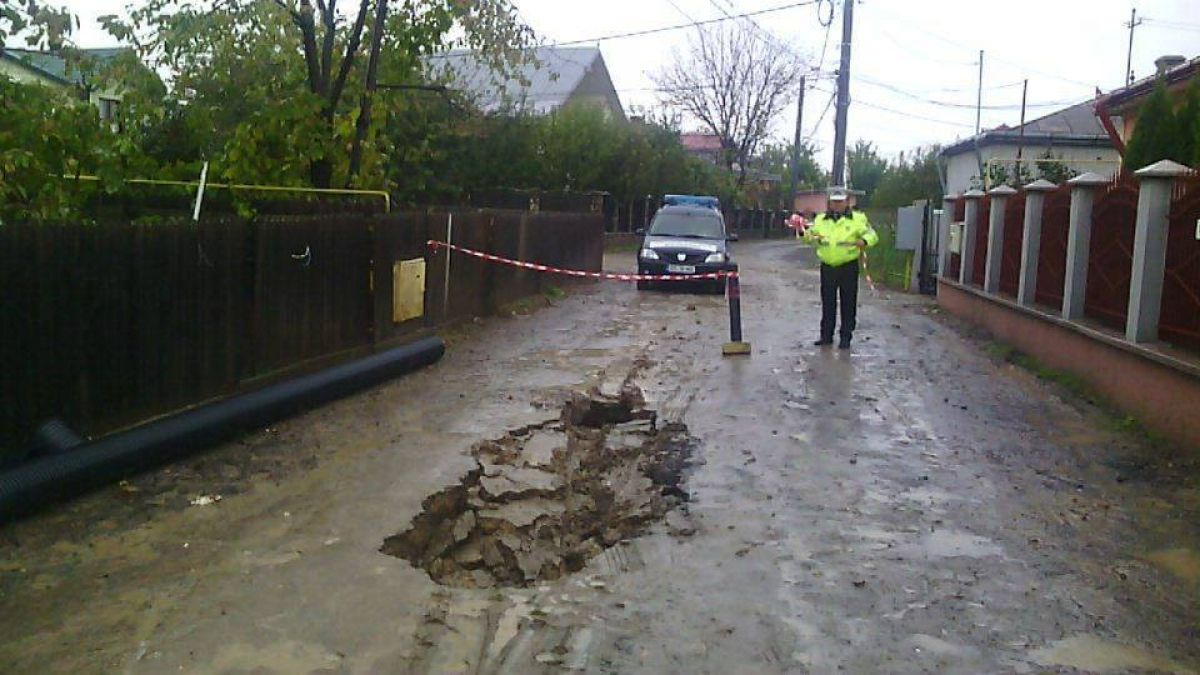 Autoturismul a fost scos de echipajele de pompieri din groapa adâncă ce s-a format ca urmare a ploilor. Cu o zi înainte, la o distanță de câțiva metri, o altă surpare, la dimensiuni mai mici.