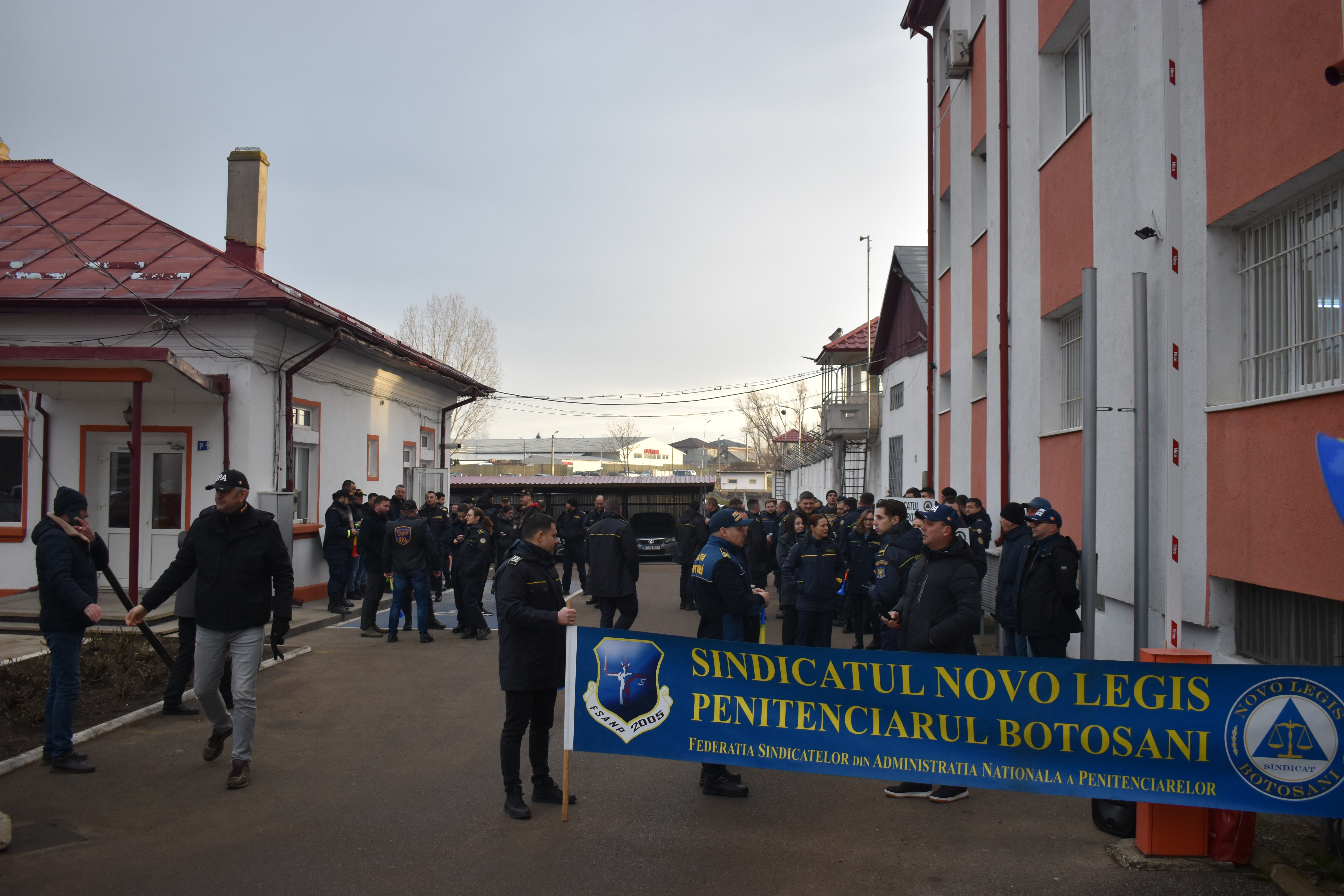 Aproximativ 150 de reprezentanți ai Penitenciarului Botoșani și ai Poliției de Frontieră au protestat astăzi în curtea unității de detenție împotriva ordonanței „trenuleț” care anulează o serie de drepturi ale angajaților .