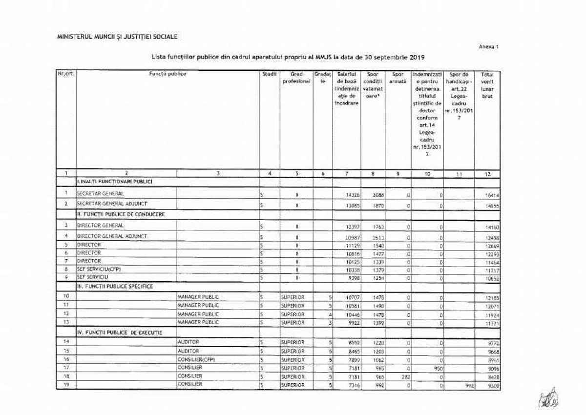 La data de 30 septembrie 2019 (mandatul lui Marius Budăi), angajații de frunte ai Ministerului Muncii primeau spor pentru condiții vătămătoare.