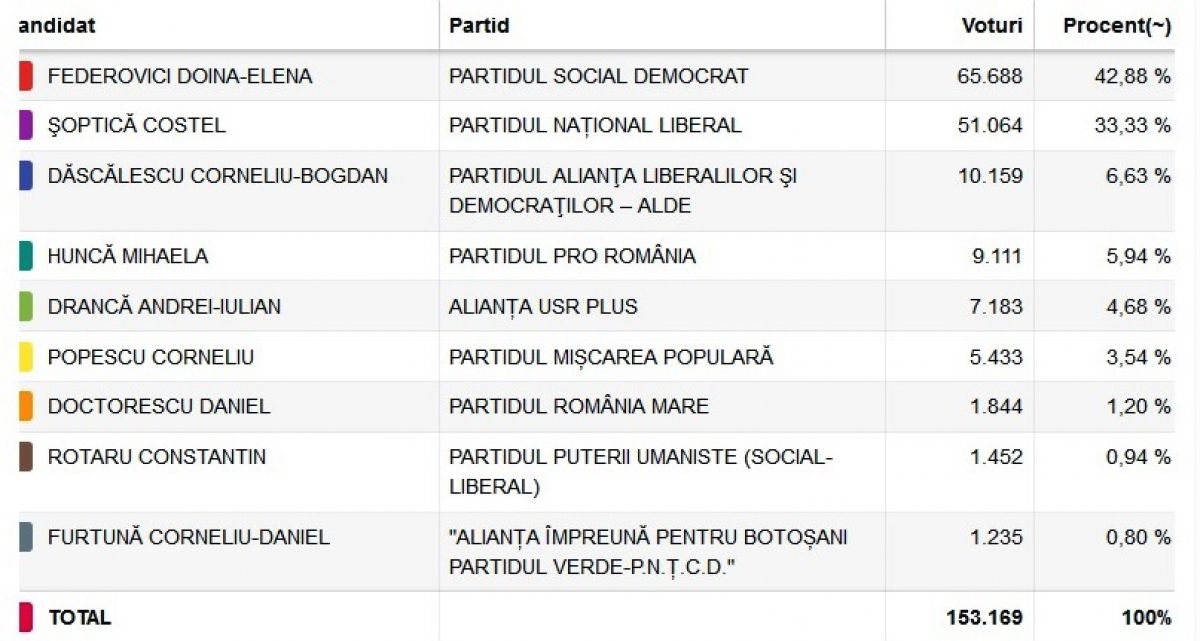Candidata PSD a obținut 42,88%, iar pretendentul PNL 33,33%, rezultând astfel o diferență de 9,55%.
