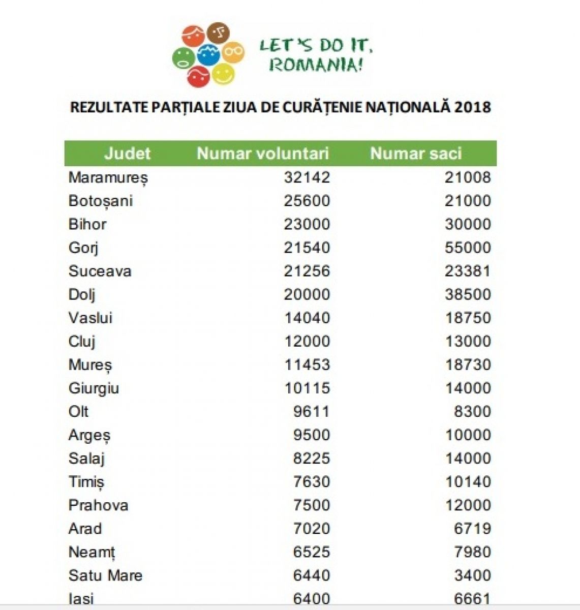 O primă estimare arată că 338 038 de voluntari au curățat 467 453 saci cu deșeuri în România. În topul județelor cu cei mai mulți voluntari se regăsesc Maramureș (32 142 voluntari –21008 saci), Botoșani (25 600 voluntari –21000 saci), Bihor (23 000 voluntari – 30 000 saci), Gorj (21 540 voluntari – 55 000 saci), Suceava (21 256 voluntari –23381 saci), Dolj (20 000 voluntari – 38 500 saci), Vaslui (14 040 voluntari – 18 750 saci), Cluj (12 000 voluntari – 13 000 saci), Mureș (11 453 voluntari – 18 730 saci), Giurgiu (10 115 voluntari – 14 000 saci).Lista cu cifrele din fiecare județ este aici.