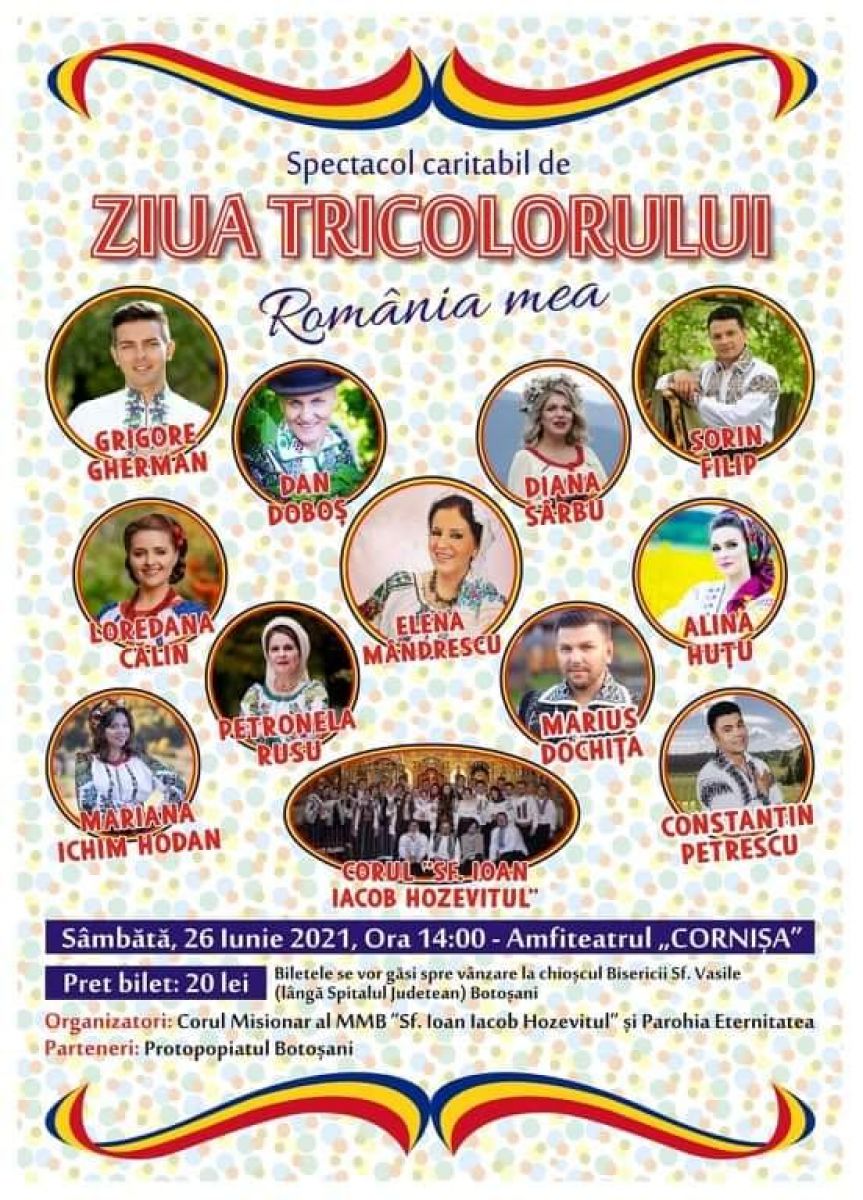 Corul Misionar al Mitropoliei Moldovei și Bucovinei „Sfântul Ioan Iacob Hozevitul” și Parohia „Eternitatea”, în parteneriat cu Protopopiatul Botoșani, Asociația „Scut Botoșănean” și Direcția Servicii Publice Sport și Agrement Botoșani, organizează un concert caritabil cu ocazia celei de-a șaptea ediții a evenimentului Ziua Tricolorului.