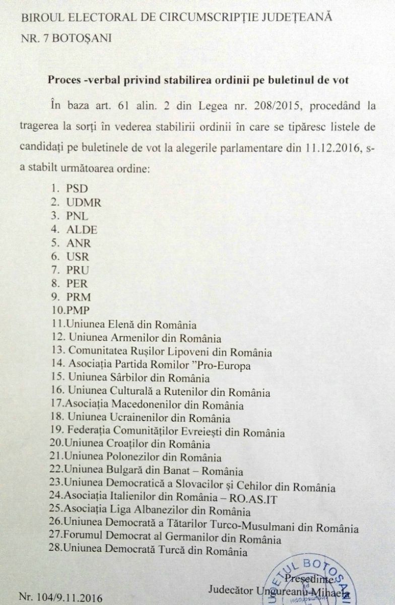 PSD Botoşani va fi prima formaţiune, iar a doua Uniunea Democrată a Maghiarilor din România, locurile trei şi patru urmând să fie ocupate de PNL şi ALDE. Poziţionarea UDMR-ului pe 2 a fost posibilă datorită sistemului de tragere la sorţi prevăzut de lege. Astfel, întâi au intrat partidele parlamentare, adică cele patru menţionate, apoi formaţiunile neparlamentare, iar în final organizaţiile minorităţilor naţionale.