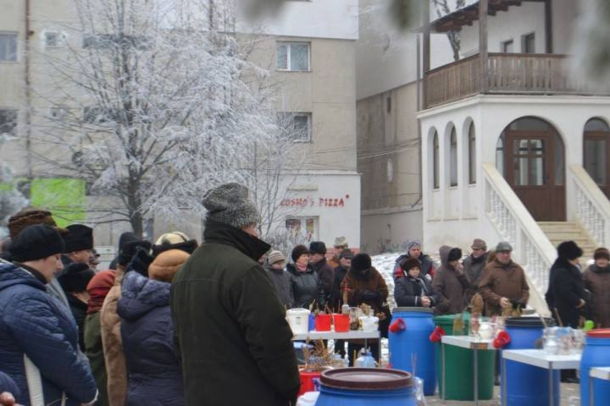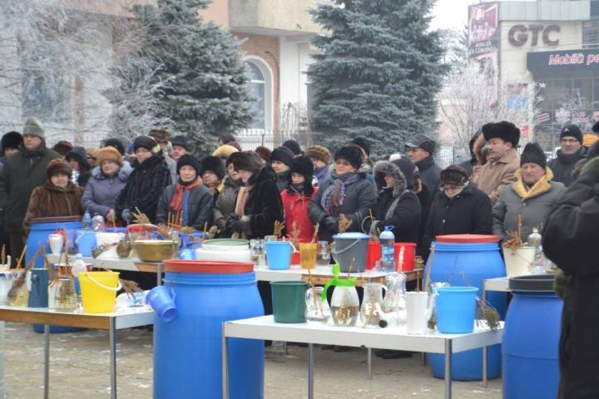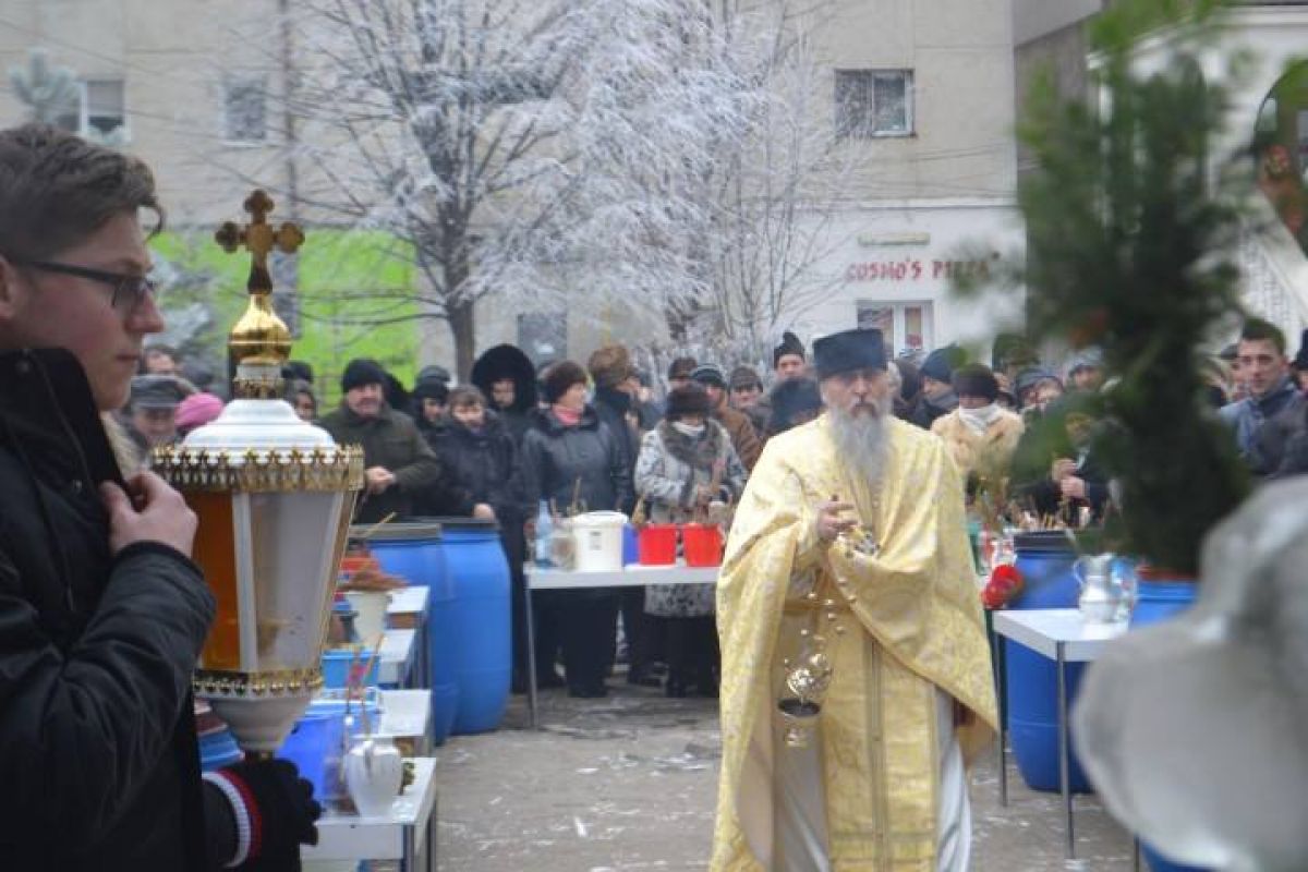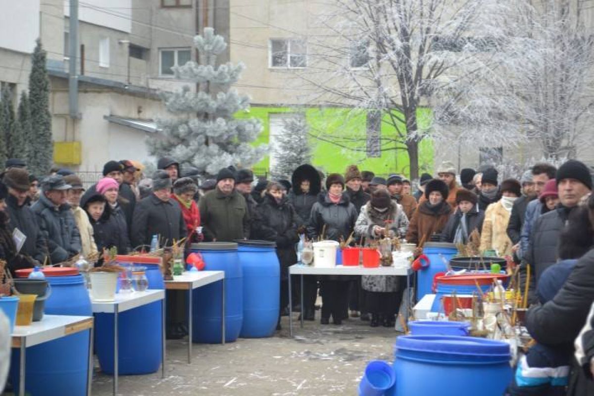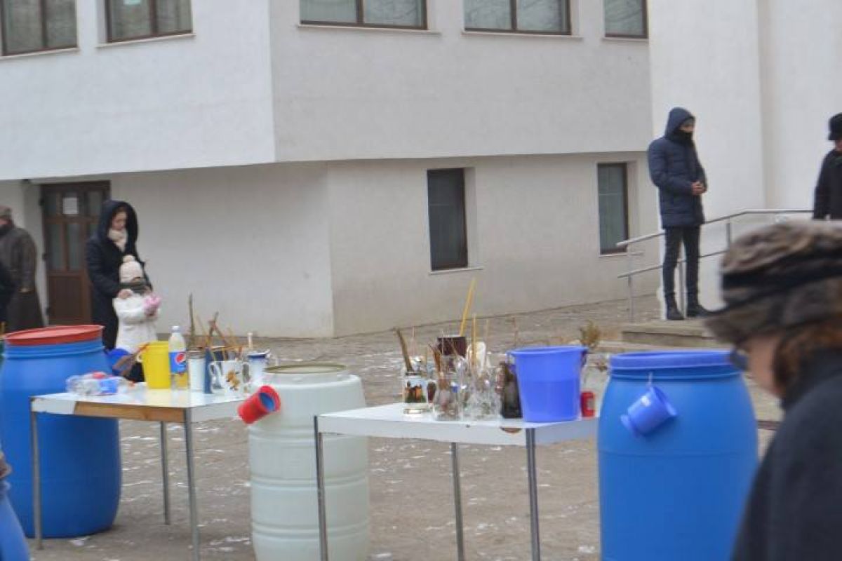 Preotul şi mai mulţi oameni ai bisericii au ieşit după ora 11:00 să sfinţească apa, iar oamenii s-au grăbit spre cele nouă butoaie aşezate într-un careu, în faţa intrării principale a bisericii.