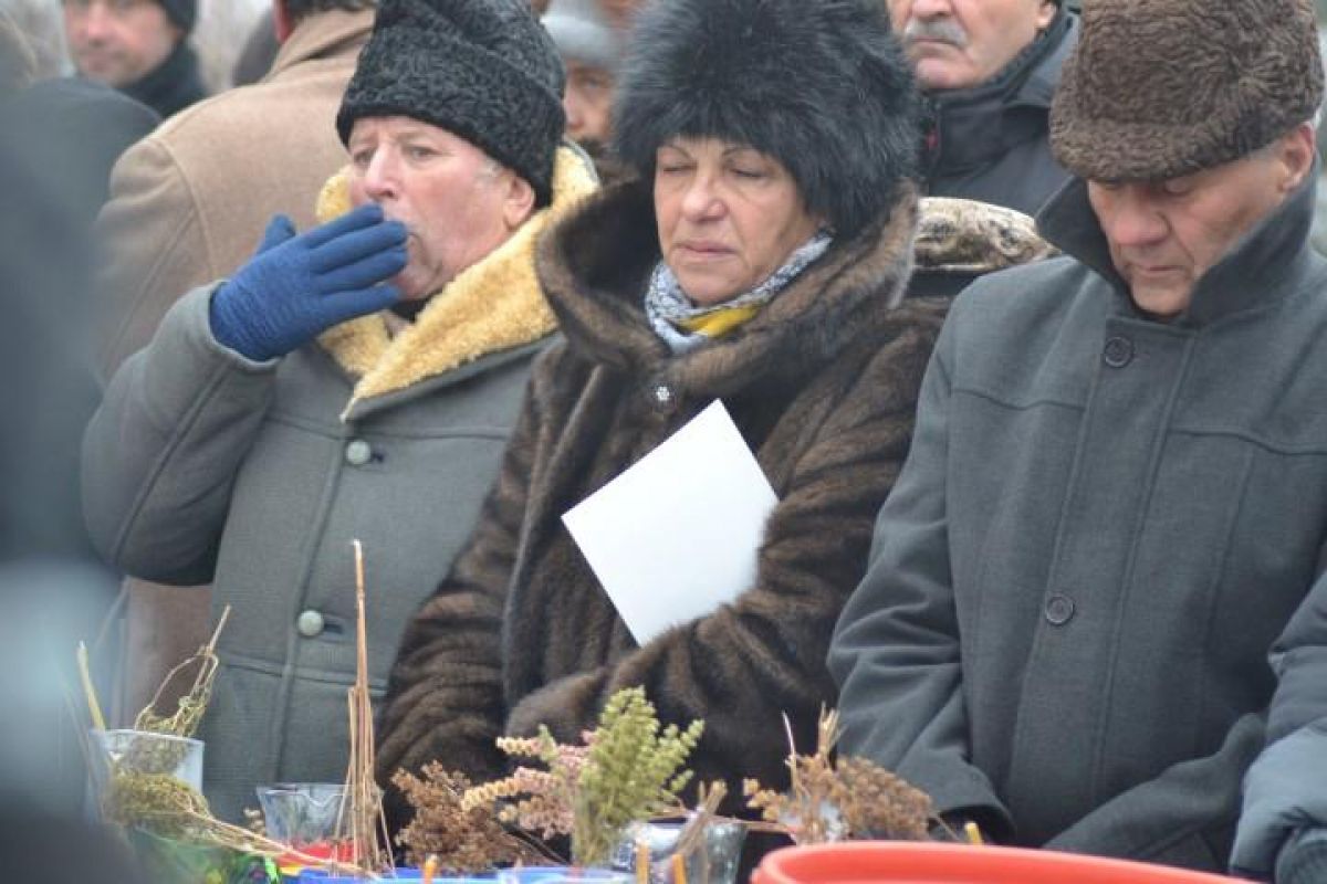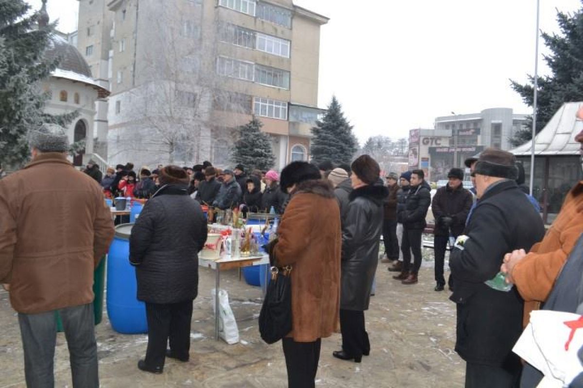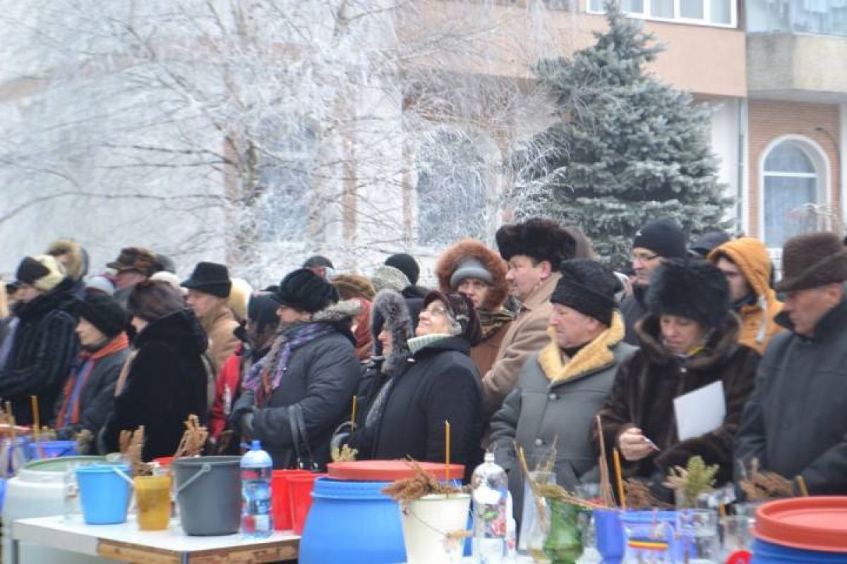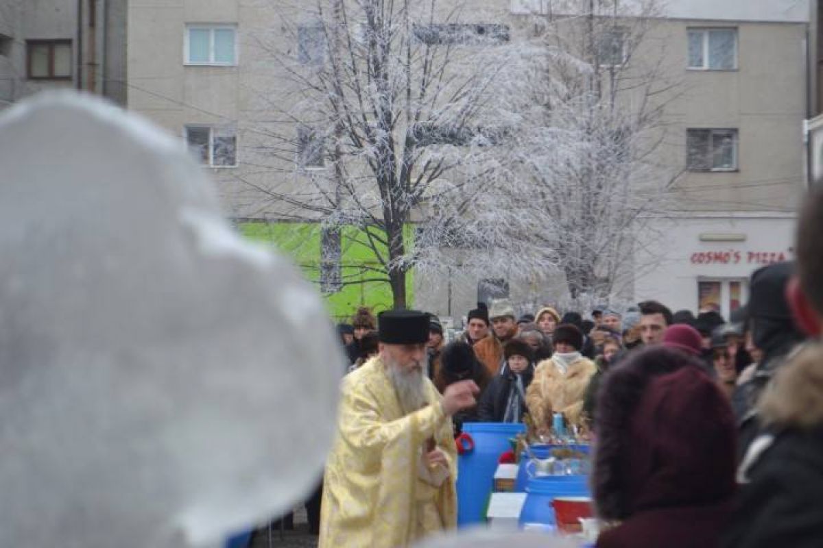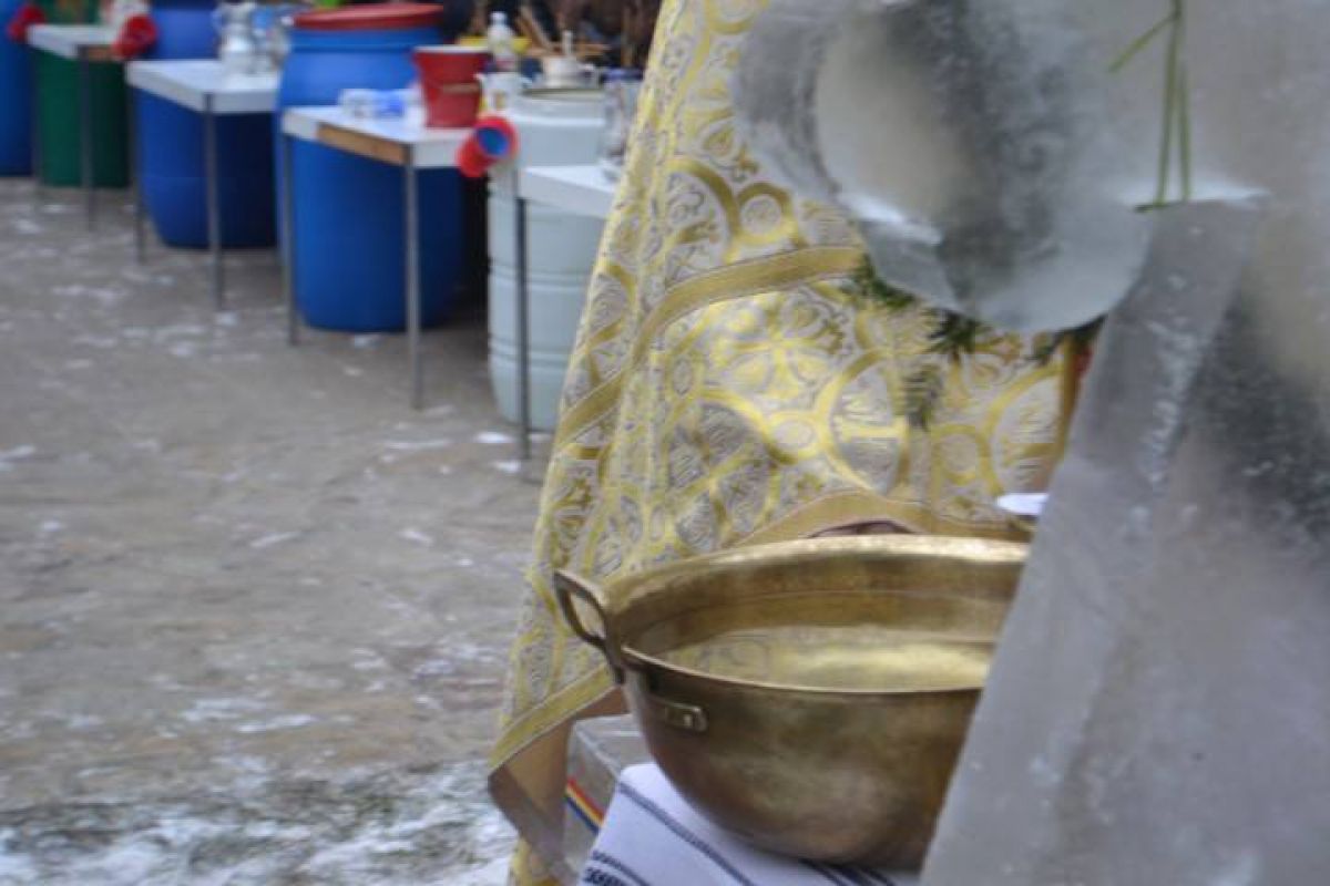 Preotul şi mai mulţi oameni ai bisericii au ieşit după ora 11:00 să sfinţească apa, iar oamenii s-au grăbit spre cele nouă butoaie aşezate într-un careu, în faţa intrării principale a bisericii.