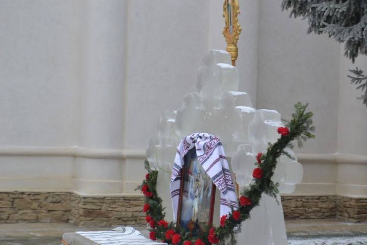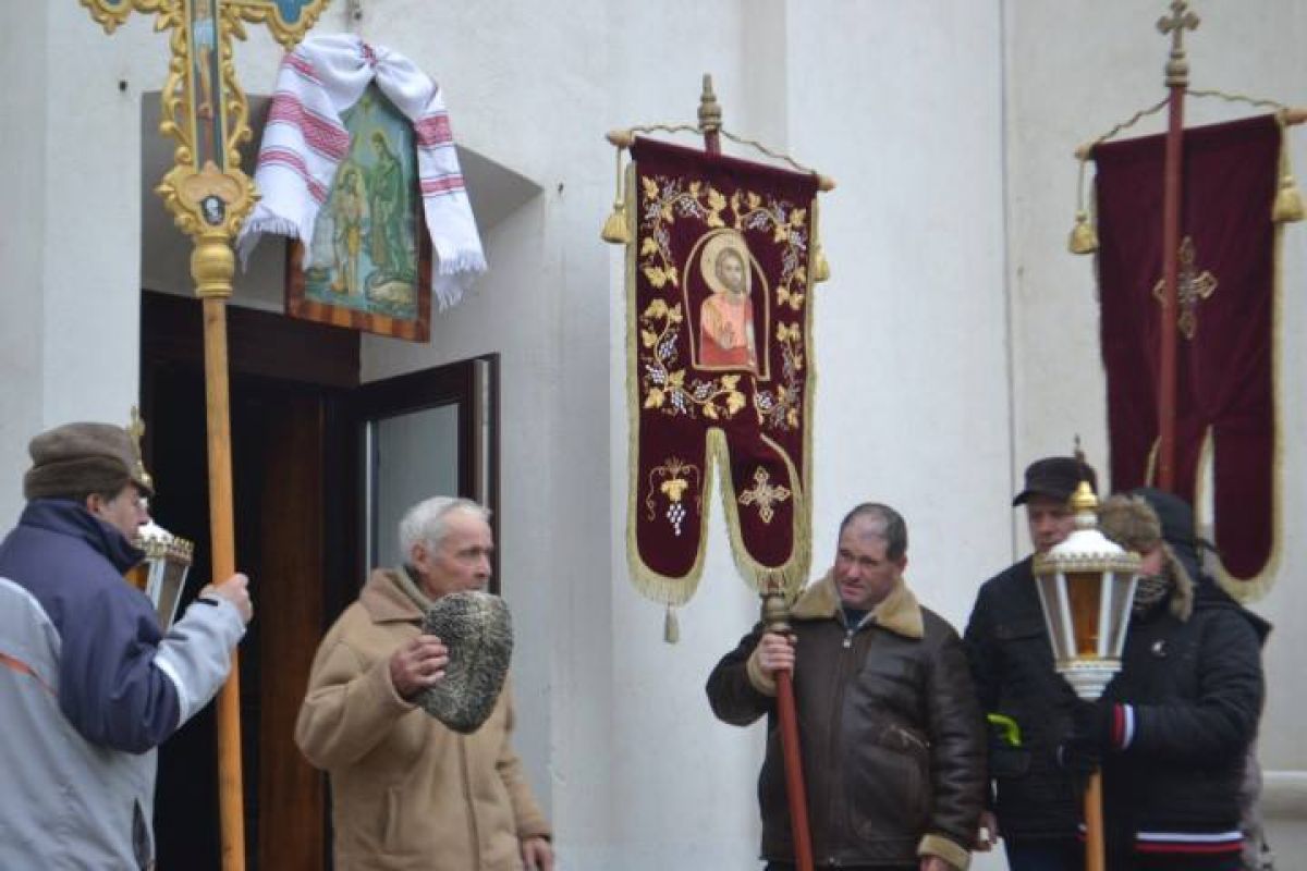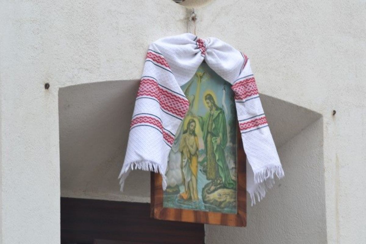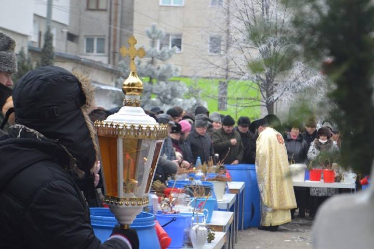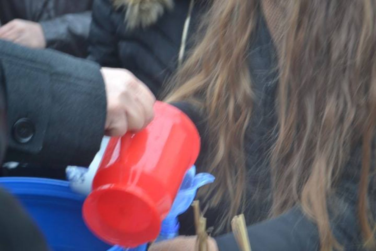 Preotul şi mai mulţi oameni ai bisericii au ieşit după ora 11:00 să sfinţească apa, iar oamenii s-au grăbit spre cele nouă butoaie aşezate într-un careu, în faţa intrării principale a bisericii.