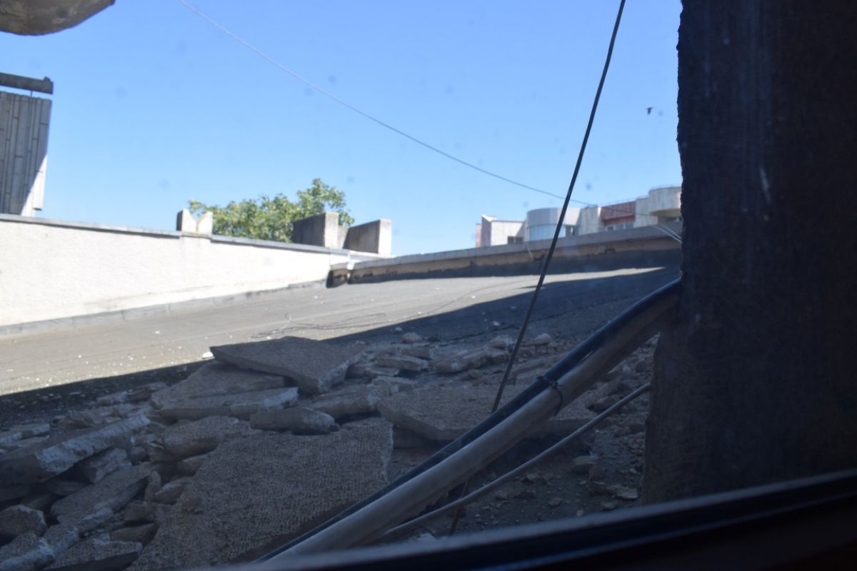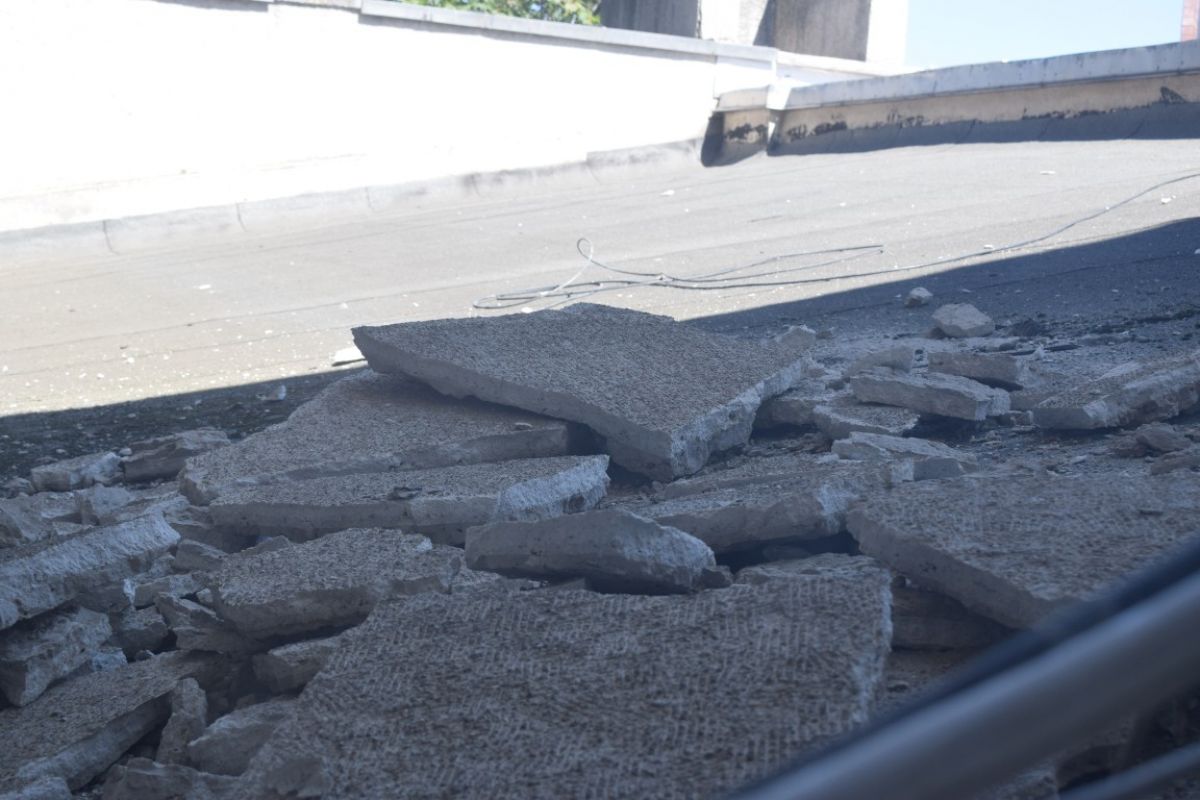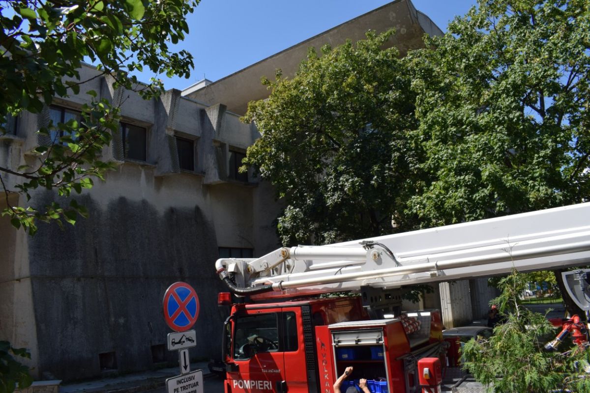 Bucățile de tencuială au căzut pe terasa care avea covor de smoală, unele rămânând efectiv înfipte. Astăzi, pompierii au fost solicitați să intervină pentru a nu se desprinde și alte părți din tencuială.