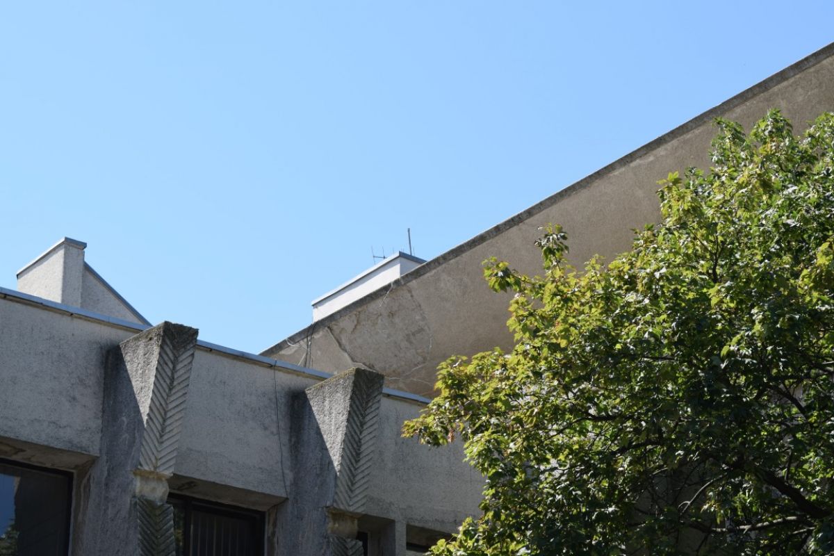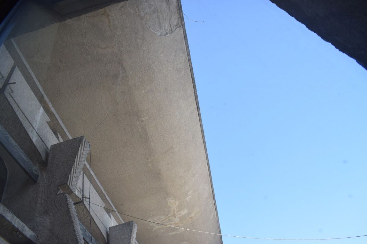 Clădirea s-a zguduit la propriu după ce o bucată mare de tencuială s-a desprins de pe fațada exterioară și s-a prăbușit pe o terasă de la primul etaj.