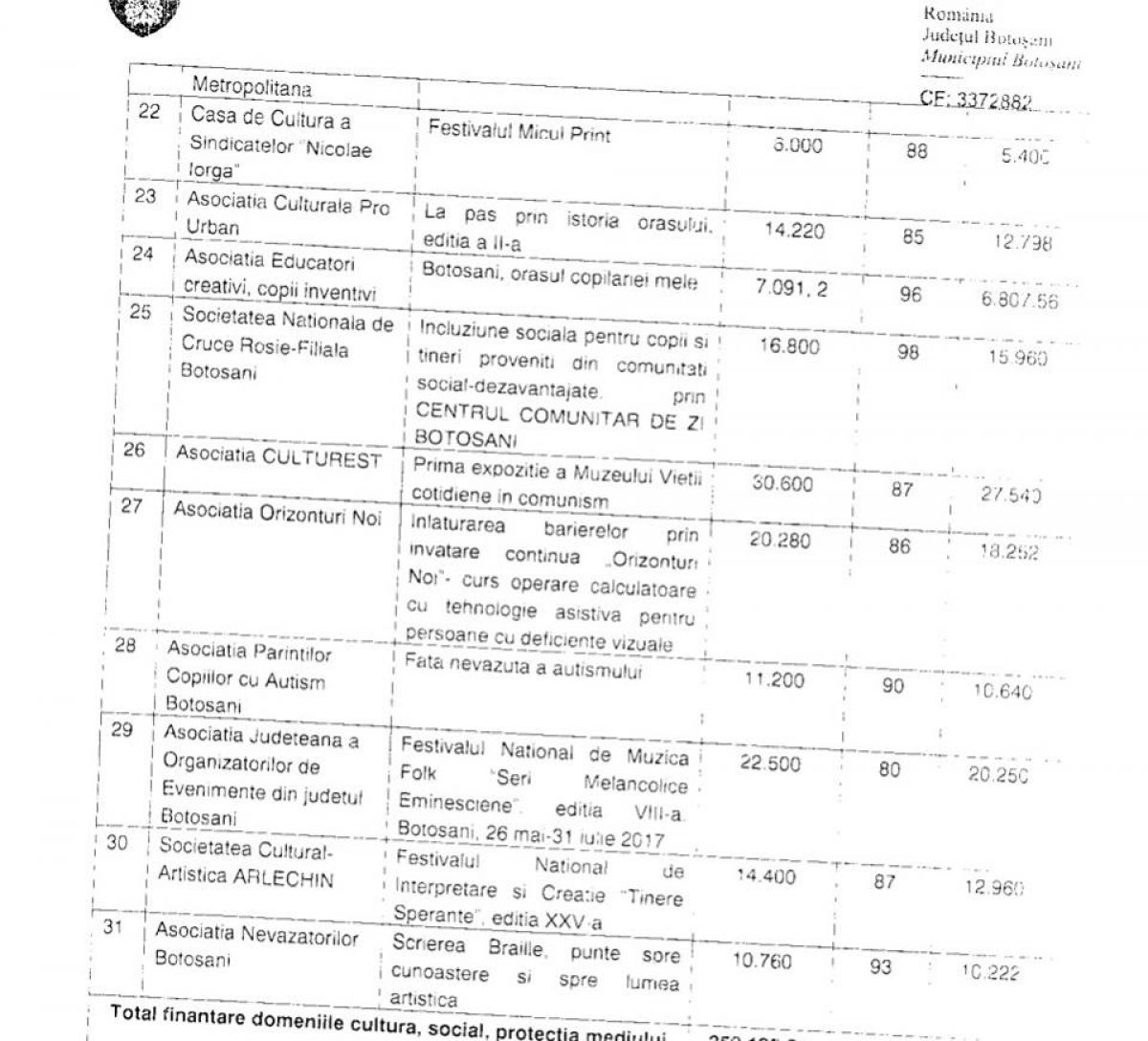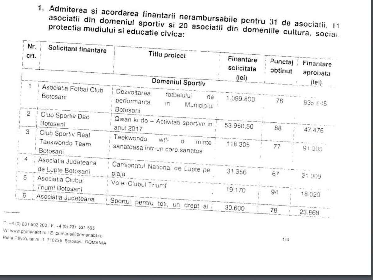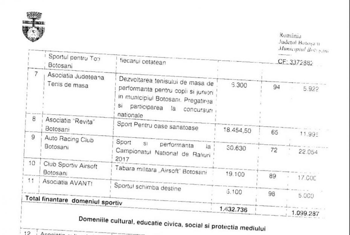 FC Botoșani a primit o sumă de 835.000 de lei, dintr-un total de 1.099 cât au solicitat prin proiect. De asemenea, o sumă semnificativă a primit și Club Sportiv Real Taekwondo Team Botoșani respectiv, 91.095 de lei.