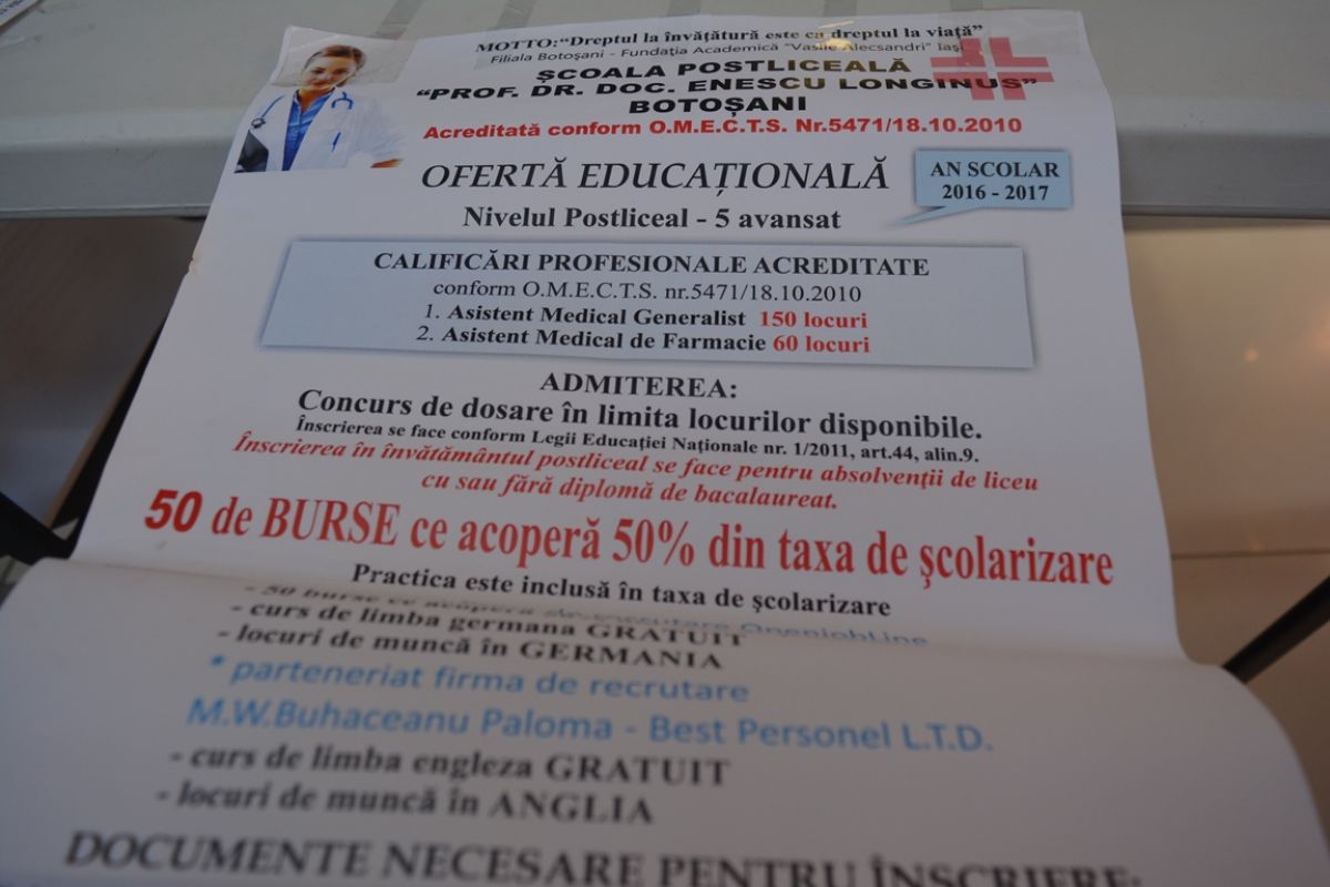 În paralel, au împărțit și vor mai distribui flyere cu oferta educațională de la Şcoala Postliceală „Dr.Doc. Enescu Longinus”. Unitatea, care își desfășoară activitatea la Școala de Cooperație, este acreditată pentru cursuri de asistenți medicali generaliști și asistenți de farmacie și oferă absolvenților locuri de muncă în Germania.
