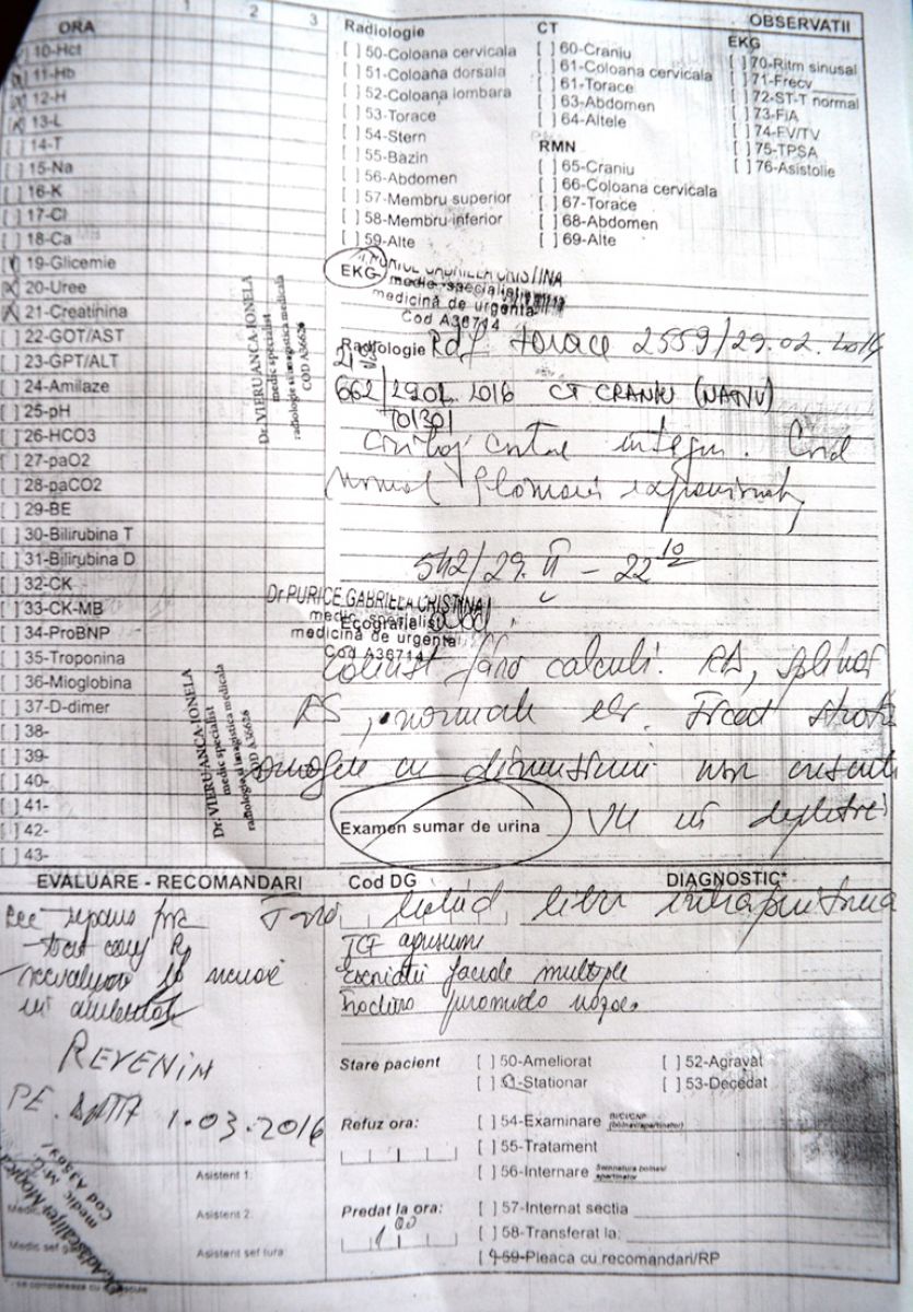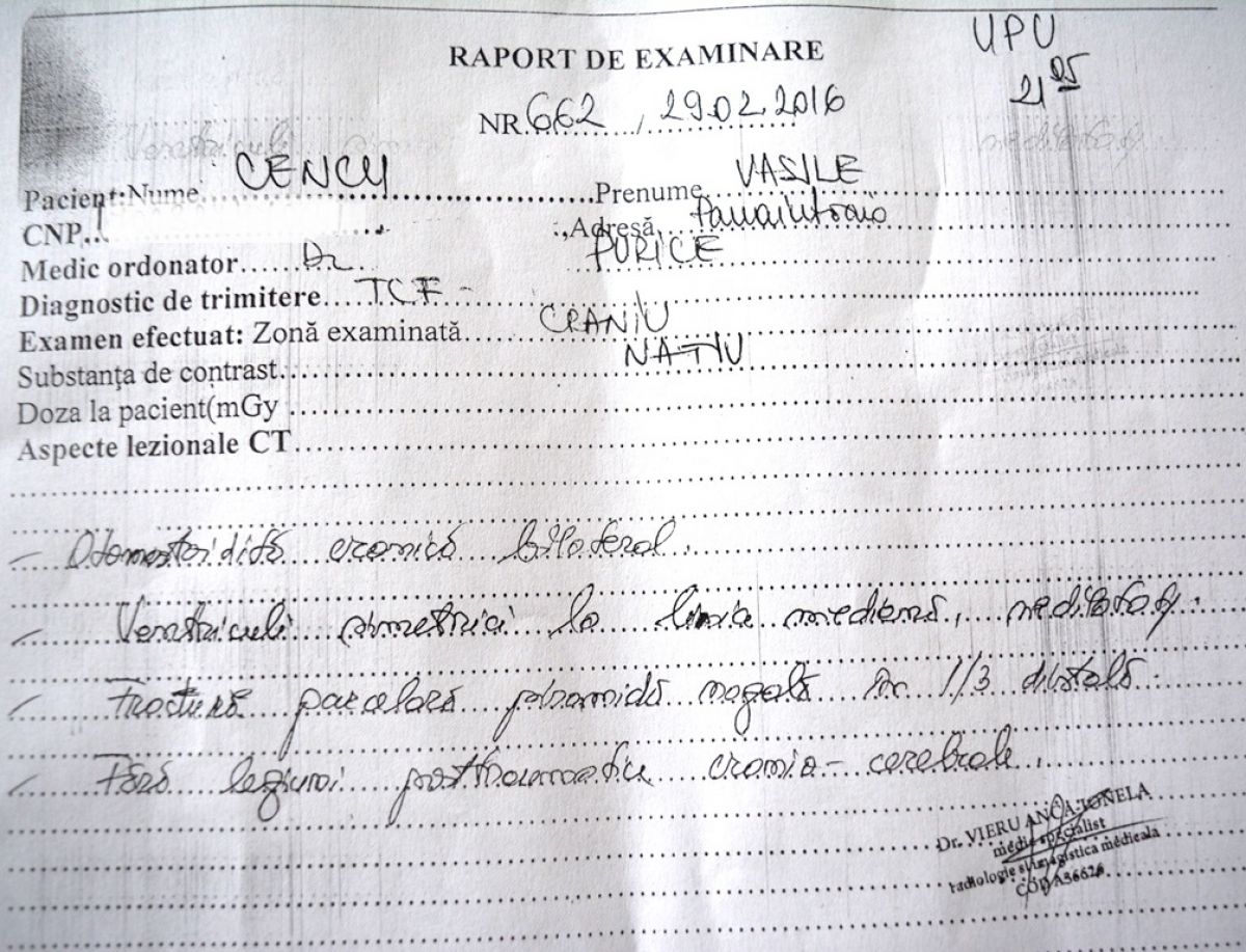”TCF agresiuni”, ”Excoriații faciale multiple”, ”fractură piramidă nazală”, ”traumatism cranio-facil – agresiune”, i-au scris doctorii în raportul de examinare. Vasile Cencu a plecat de la UPU în jurul orei 2:00, iar marți s-a deplasat la Inspectoratul de Poliție Județean și Inspectoratul Teritorial de Muncă, unde a depus plângeri.