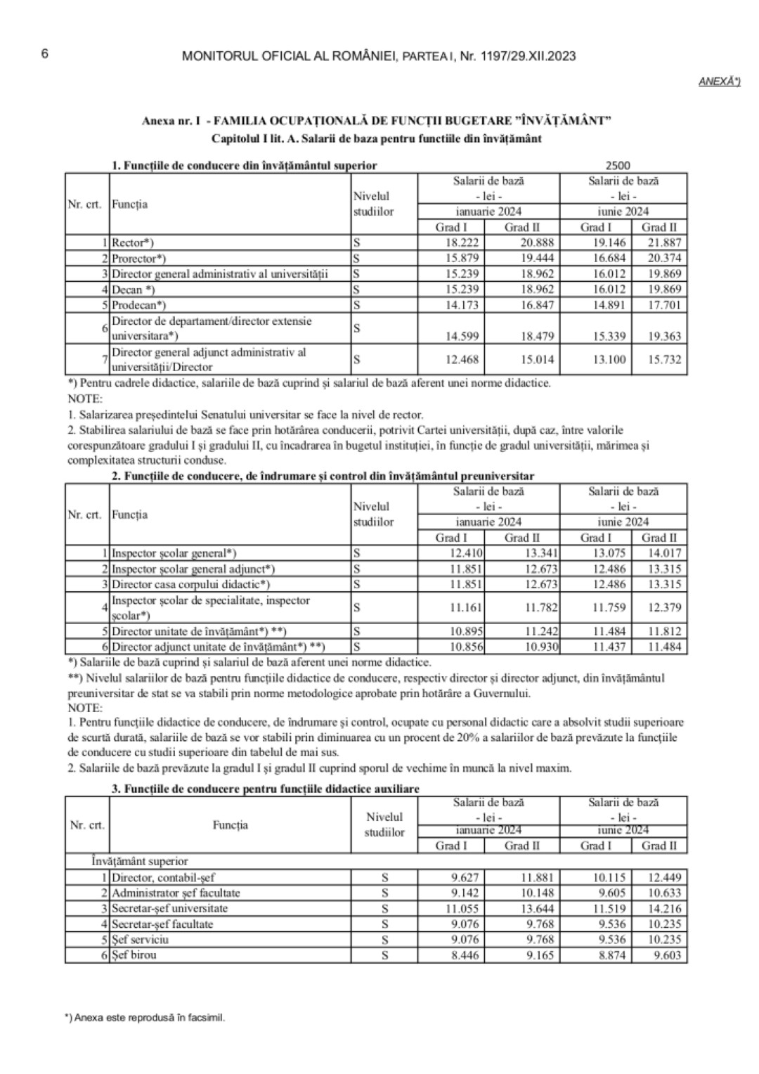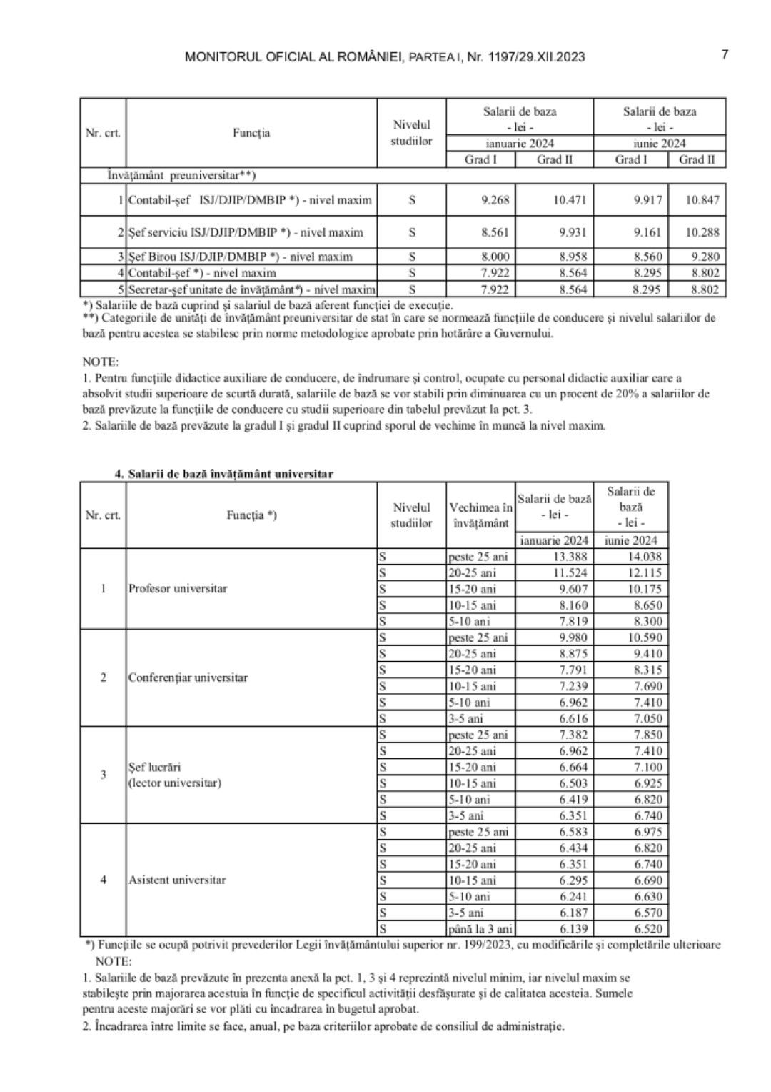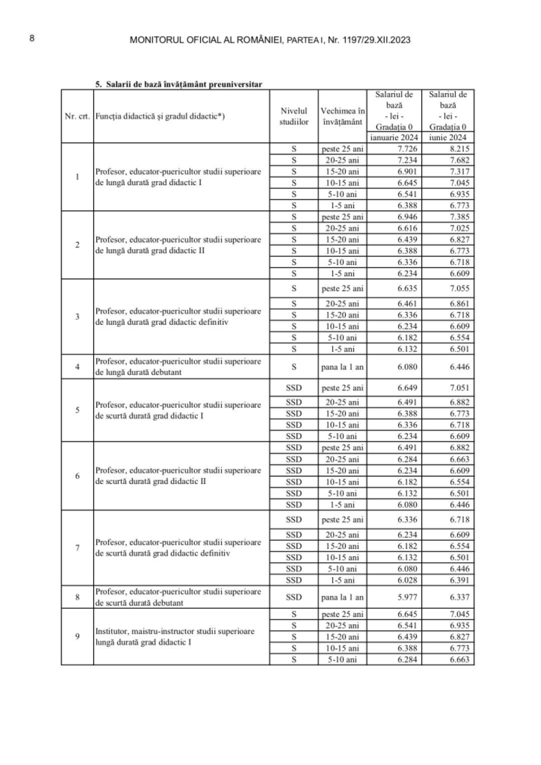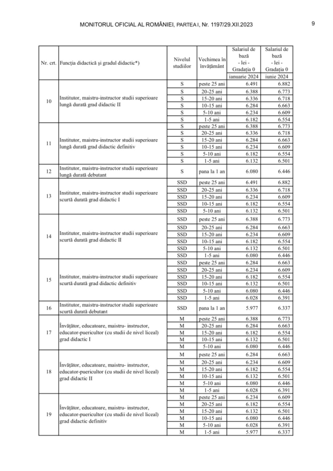 Grilele publicate sunt referitoare la salariile de bază brute, echivalente pentru gradația 0, pe fiecare funcție, tranșă de vechime și grade didactice, potrivit romaniatv.net.