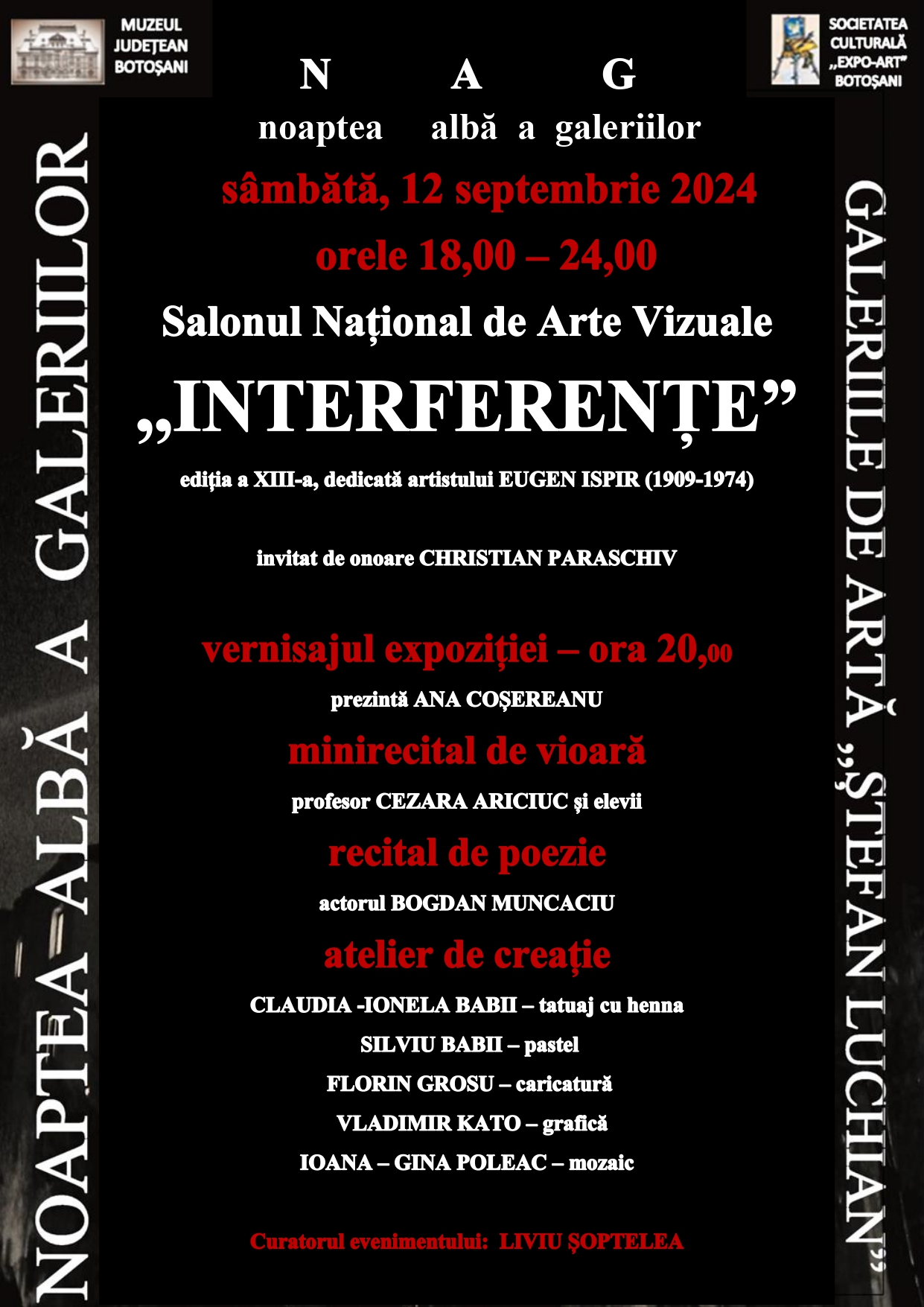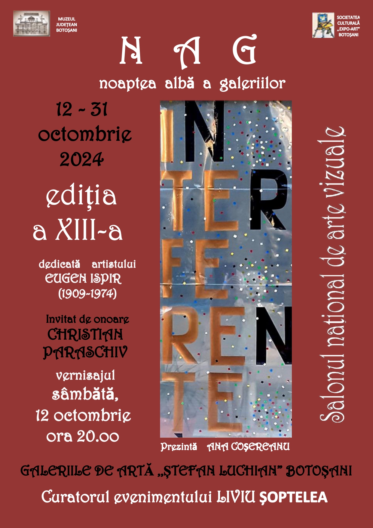 Muzeul Județean Botoșani găzduiește, în perioada 12-31 octombrie 2024, în spațiul Galeriilor de Artă „Ștefan Luchian” Botoșani, Salonul Național de Arte Vizuale „Interferențe”, ediția a XIII-a. Evenimentul expozițional, organizat de Societatea Culturală „Expo-Art” Botoșani, este dedicat artistului Eugen Ispir (1909-1974), inițiatorul primei pinacoteci publice la Botoșani, multe dintre lucrările sale regăsindu-se în patrimoniul instituției muzeale botoșănene.