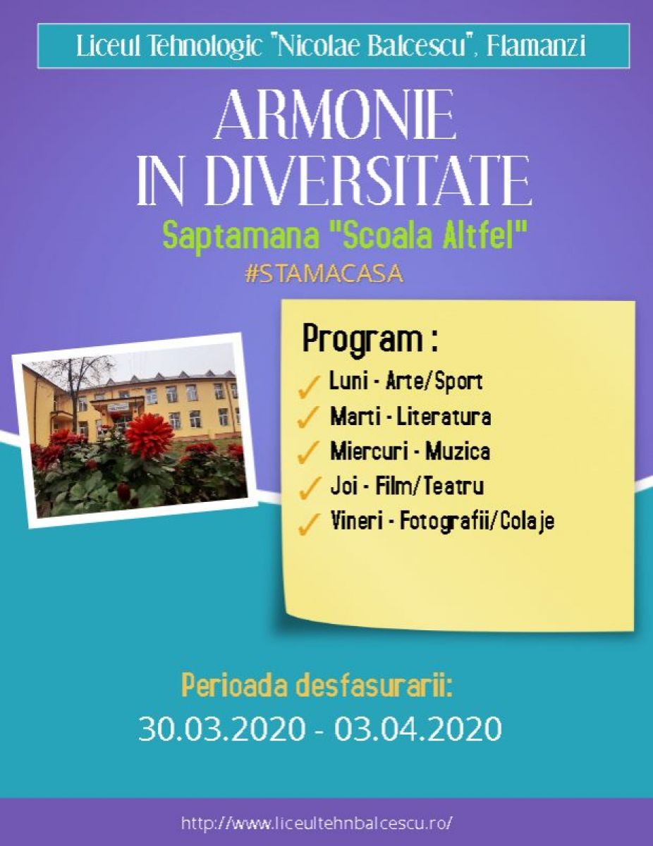 Astfel, proiectul ”Armonie în diversitate” s-a adaptat cerințelor impuse de starea de urgență și ordonanțele militare, toate activitățile desfășurându-se prin intermediul mijloacelor online de comunicare.