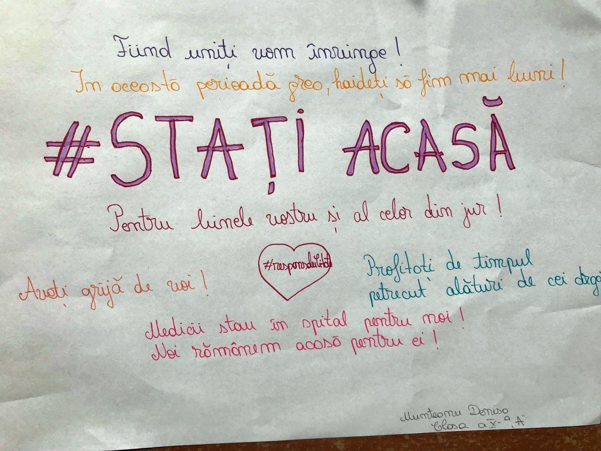 În aceste condiții nu au lipsit temele caracteristice perioadei dificile pe care o traversăm cu toții, unii copii realizând desene cu mesaje precum: ”Noi stăm acasă”, ”Totul va fi bine”, ”Sănătate”, ”Vom învinge”, ”#StațiAcasă pentru binele vostru și cel celor din jur”.
