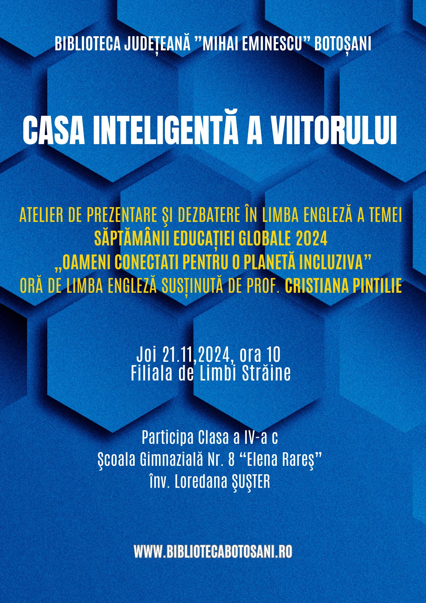 Activitatea are titlul ”Casa Inteligentă a viitorului” şi îşi propune să fie un atelier de prezentare şi dezbatere în limba engleză a temei Săptămânii Educaţiei Globale din acest an: „Oameni conectați pentru o planetă incluzivă”.