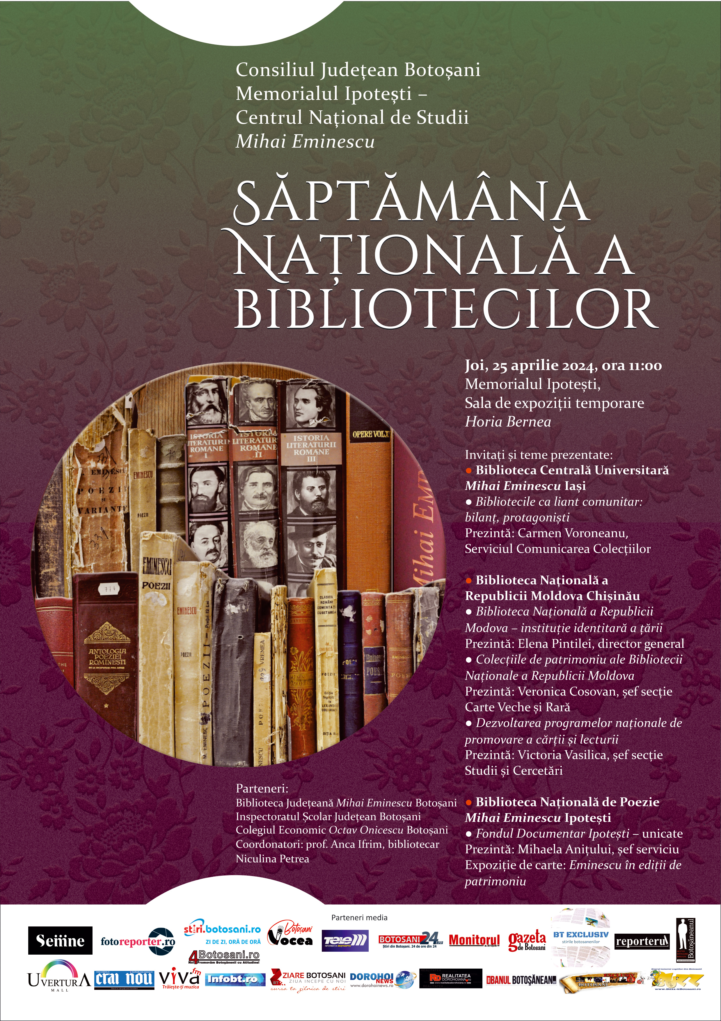 Memorialul Ipotești ‒ Centrul Național de Studii Mihai Eminescu, instituție aflată în subordinea Consiliului Județean Botoșani, organizează, în perioada 23-29 aprilie 2024, ediția anuală Săptămânii Naționale a Bibliotecilor.