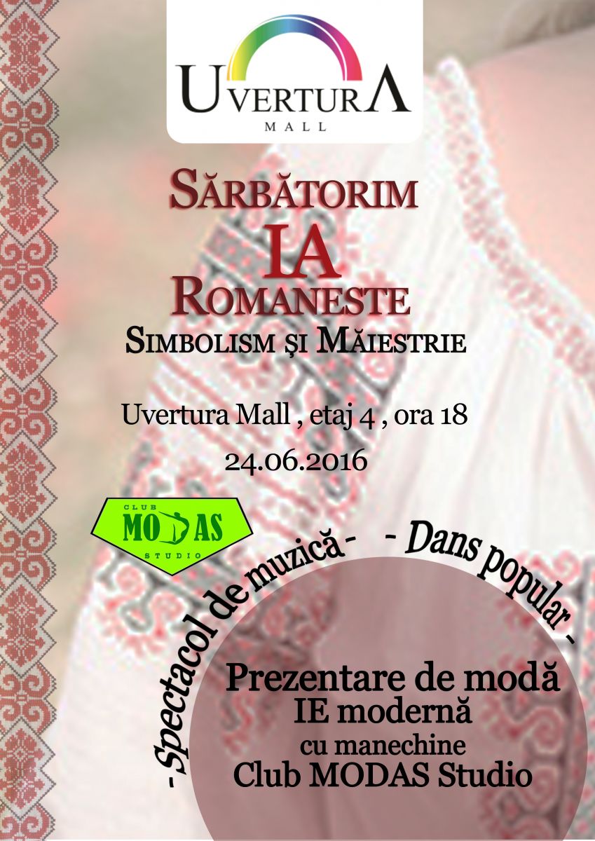 Ziua de vineri va fi celebrată cu cântece și dansuri dar și prin parade de modă ale costumelor tradiționale, cât și a pieselor vestimentare (ii, cardigane și rochii) ce poartă o notă modernistă. Evenimentul, în parteneriat cu Club Modas Studio și Asociația Elcor din localitatea Pomârla, va avea loc în Uvertura Mall, la etajul 4, începând cu orele 18:00, pe 24 iunie 2016. Uvertura Mall încurajează toți botoșănenii ca în această zi să poarte cu mândrie iia românească și îi răsplătește cu vouchere supriză, pe primii 100 de clienți care vor veni îmbrăcați în ie.