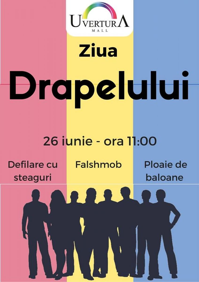 Duminică, 26 iunie este Ziua Drapelului Național al României, zi instituită în 1848 când Guvernul revoluționar a decretat ca Tricolorul - roșu, galben și albastru - să reprezinte steagul național al tuturor românilor. Cele trei culori împărțite în mod egal reprezintă principiul egalității, orientarea culorilor în sus semnifică verticalitatea, iar cifra trei este considerată numărul perfect. Uvertura Mall va marca această zi, de la ora 11:00, prin sute de baloane colorate care vor fi aruncate de pe centrul comercial și printr-un flash mob în colaborare cu G-Power, Club Modas Studio și Acțiunea 2012. Toți botoșănenii sunt invitați să se alăture bucuriei și dansului.