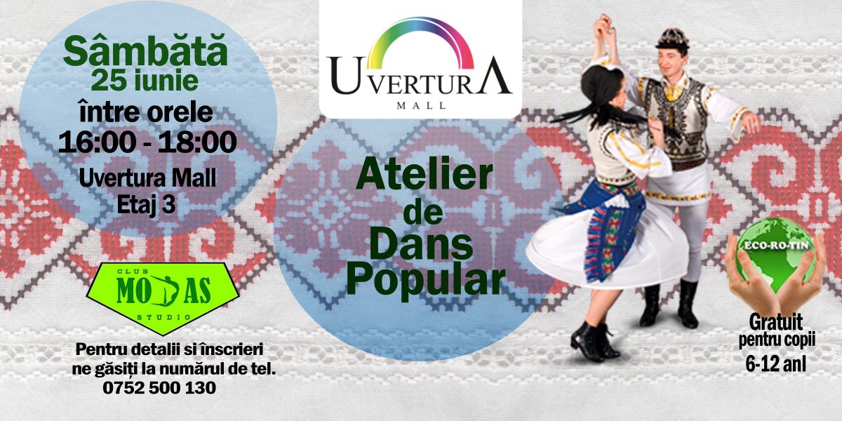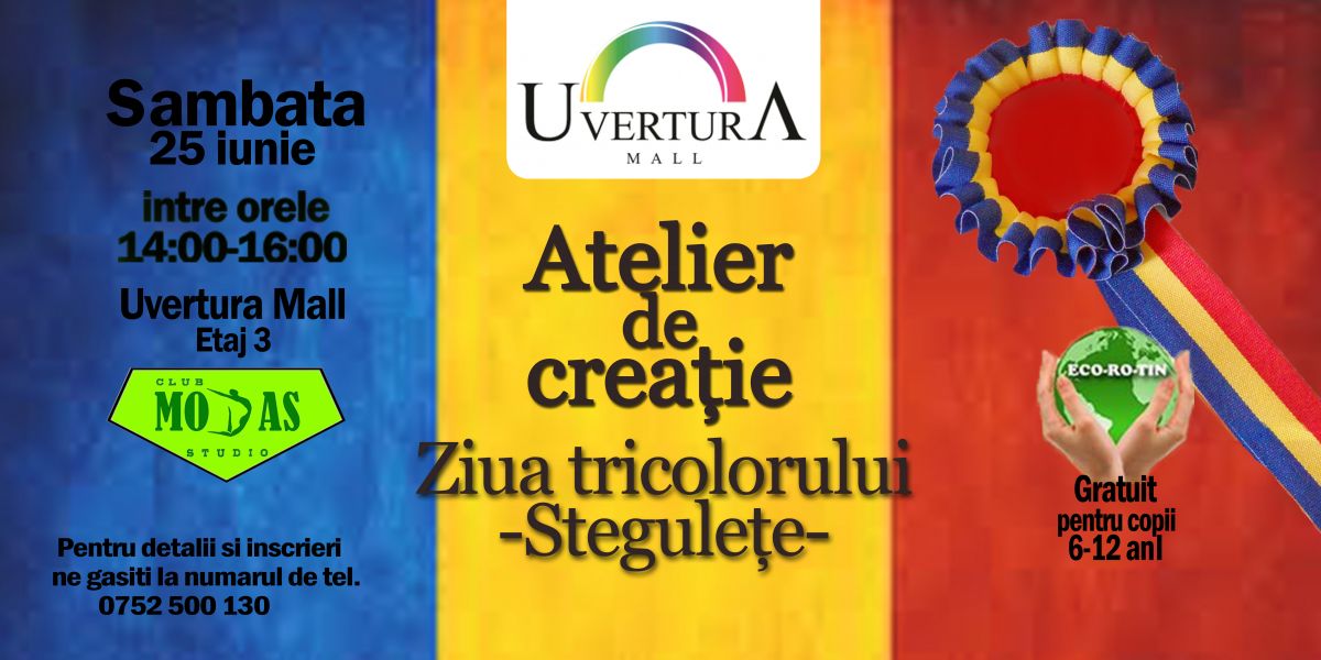 Sâmbătă, 25 iunie, începând cu orele 14:00, Uvertura Mall în colaborare cu Club Modas Studio organizează Atelierul gratuit de Creație, unde sunt așteptați toți copiii cu vârsta cuprinsă între 6 și 14 ani să confecționeze prin diferite tehnici tricolorul românesc, sub îndrumarea moderatorilor. De la ora 16:00, se continuă cu promovarea tradițiile românești prin dansuri populare. Fie că le sunt cunoscuți pașii sau nu, copiii sunt așteptați să se prindă în cea mai mare horă moldovenească organizată la Uvertura Mall.