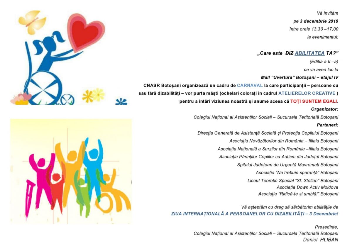 Cu acest prilej, Colegiul Național al Asistenților Sociali – Structura Teritorială Botoșani, în parteneriat cu Direcţia Generală de Asistenţă Socială şi Protecţia Copilului Botoşani (Complex de apartamente ”Cireșarii”, Centrul de zi pentru copii cu nevoi speciale ”Șansa mea”, Complex de case de tip familial ”Sf. Mina”, Centrul de Plasament ”Prietenia” și Centrul de abilitare și reabilitare pentru persoane cu dizabilități ”Lucie Lecomte” ) , Asociația Nevăzătorilor din România – filiala Botoșani, Asociația Națională a Surzilor din România –filiala Botoșani, Asociația Părinților Copiilor cu Autism din Județul Botoșani, Asociația “Ne trebuie speranță” Botoșani, Asociația ”Down Activ” Moldova, Asociația ”Ridică-te și umblă!” și Școala Profesională Specială ”Sf. Stelian” Botoșani organizează cadrul necesar de manifestare a abilităților într-o atmosferă de carnaval la care participanții – persoane cu sau fără dizabilități – vor purta măști (ochelari colorați în cadrul Atelierelor creative) pentru a întări viziunea că Toți suntem egali.