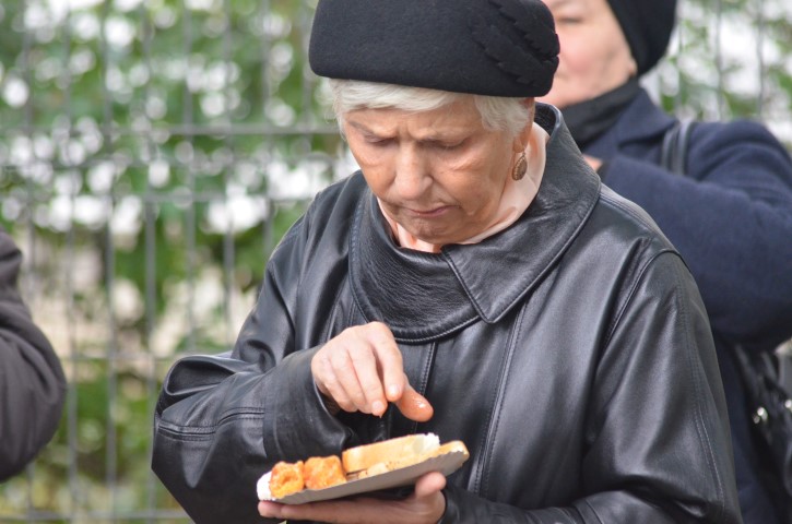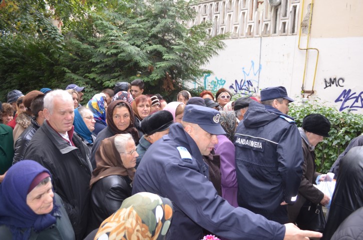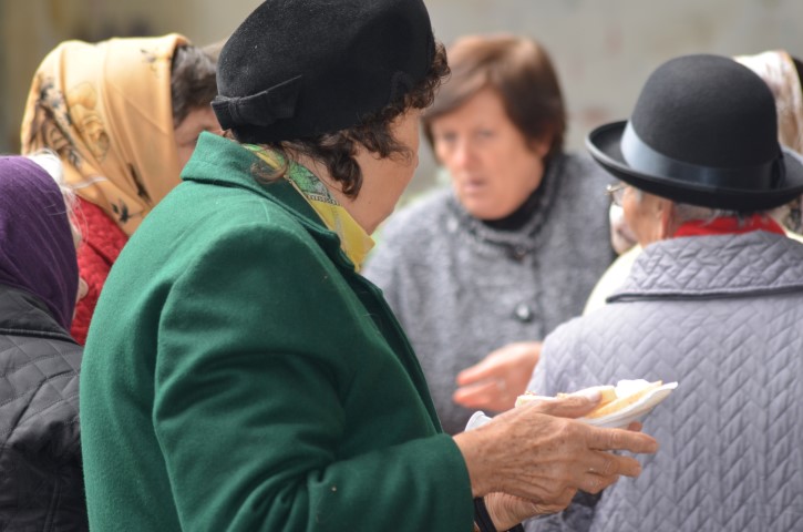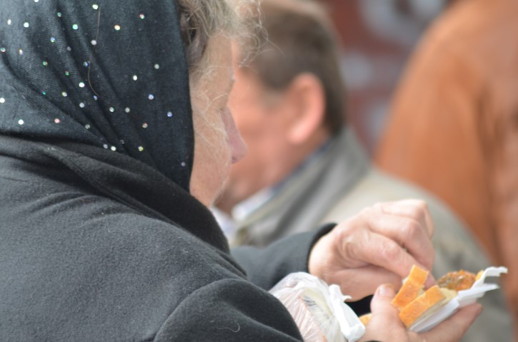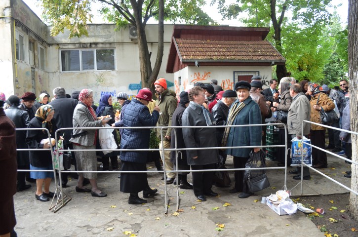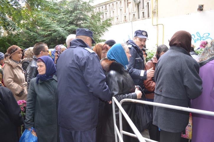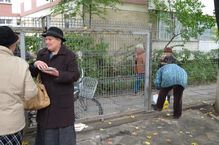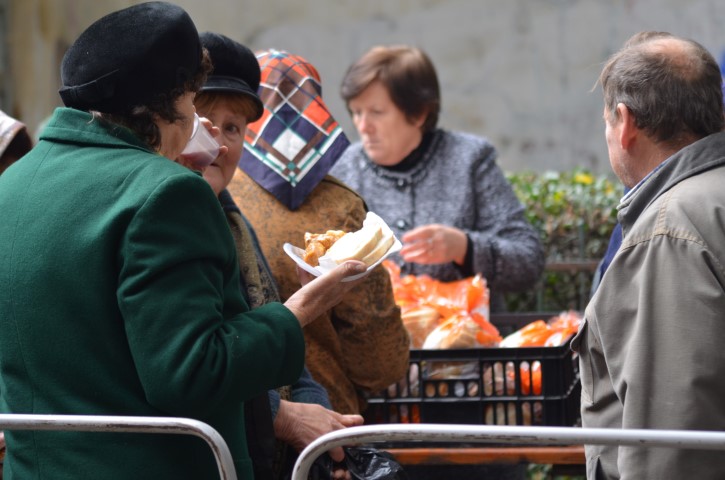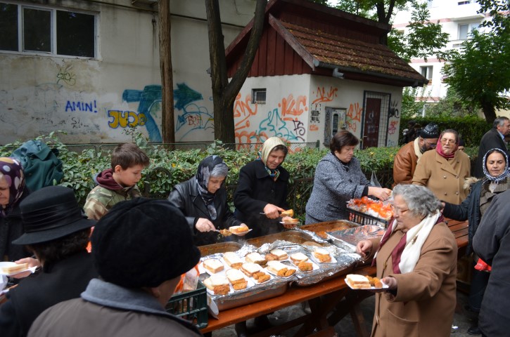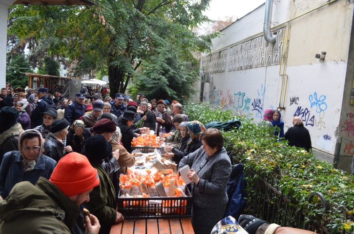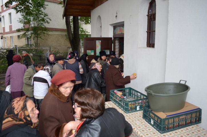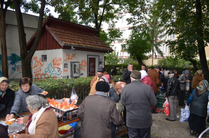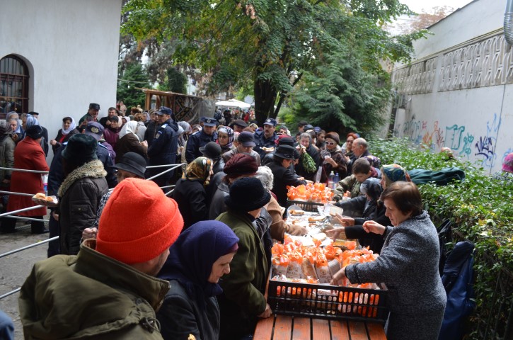 După slujba ce a fost oficiată în marea sărbătoare din data de 14 octombrie la Biserica Sfânta Cuvioasa Parascheva de pe Pietonalul Unirii, așa cum este rânduiala creștină, a urmat împărțirea sarmalelor fierte în cazane uriașe de oamenii locașului sfânt. Echipajele de jandarmi au încercat să mențină o oarecare ordine la coada ce a fost formată și la care s-au așezat cu precădere, vârstnici de la Botoșani. Chiar și așa, oamenii s-au înghesuit împinși de teama că nu vor mai prinde din sarmale. Când s-au văzut cu farfuria în mâini, nu au mai așteptat să ajungă acasă și au servit alimentele din picioare, lângă gard sau rezemați de copacii din curte. Le-au mâncat cu repeziciune și cu privirea într-un punct mort, neinteresați de privirile celor din jur sau de foiala oamenilor din jur. (G.E.)