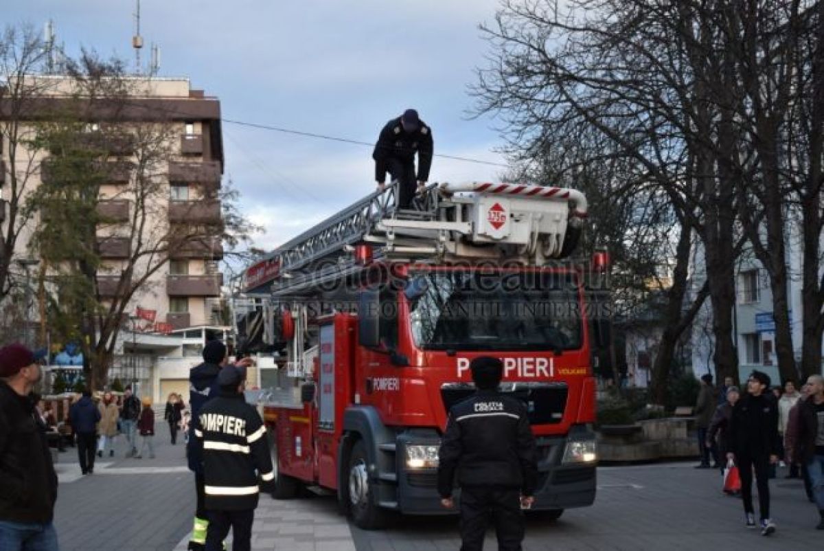 Pasărea a stat blocată în jur de o oră și jumătate până a fost observată zbătându-se. Au fost chemați pompierii care, cu greu și-au făcut loc cu autospeciala cu scară mobilă pe Pietonalul Unirii. Pe de o parte la baza pietonalului se aflau mașini parcate, iar de pe altă parte, cablurile joase au făcut ca înaintarea să fie dificilă.