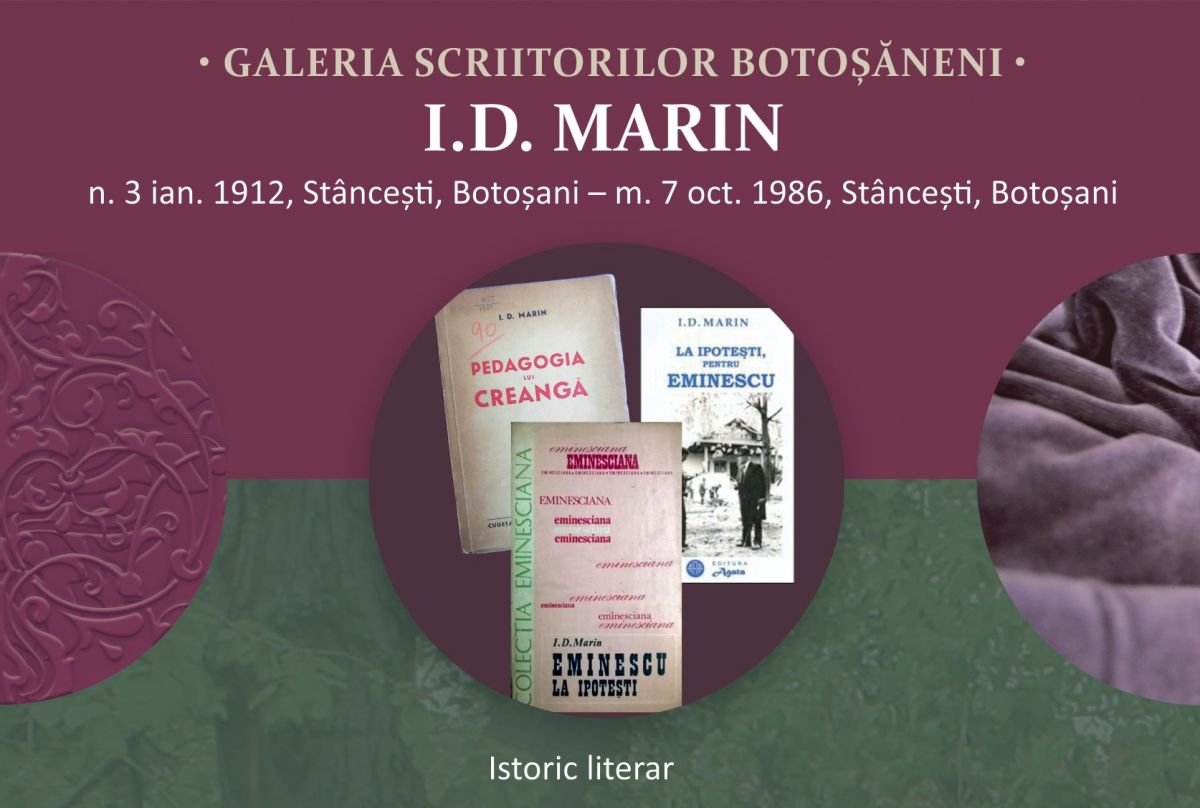 Memorialul Ipotești – Centrul Național de Studii Mihai Eminescu își propune, într-un parteneriat media cu ziarul Botoșăneanul, să prezinte, în ediția de duminică, un nou proiect intitulat Scriitori botoșăneni dincolo de Styx. Astăzi este despre I.D. Marin.