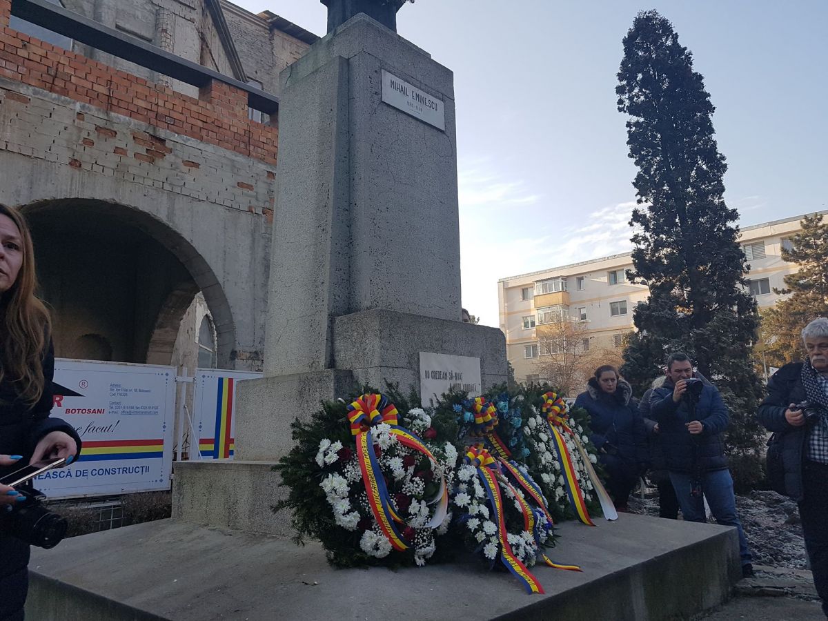 După ședința festivă a Consiliului Local Botoșani, în cadrul căreia consilierii locali au votat, în unanimitate, proiectul de Hotărâre privind conferirea Titlului de Cetățean de Onoare al Municipiului Botoșani laureatului Premiului Național de Poezie ”Mihai Eminescu” – Opera Omnia, pe anul 2019, oficialitățile au procedat, ca în fiecare an, la depunerea de jerbe la statuia lui Mihai Eminescu din fața Teatrului care poartă numele poetului născut la Botoșani pe 15 ianuarie 1850.
