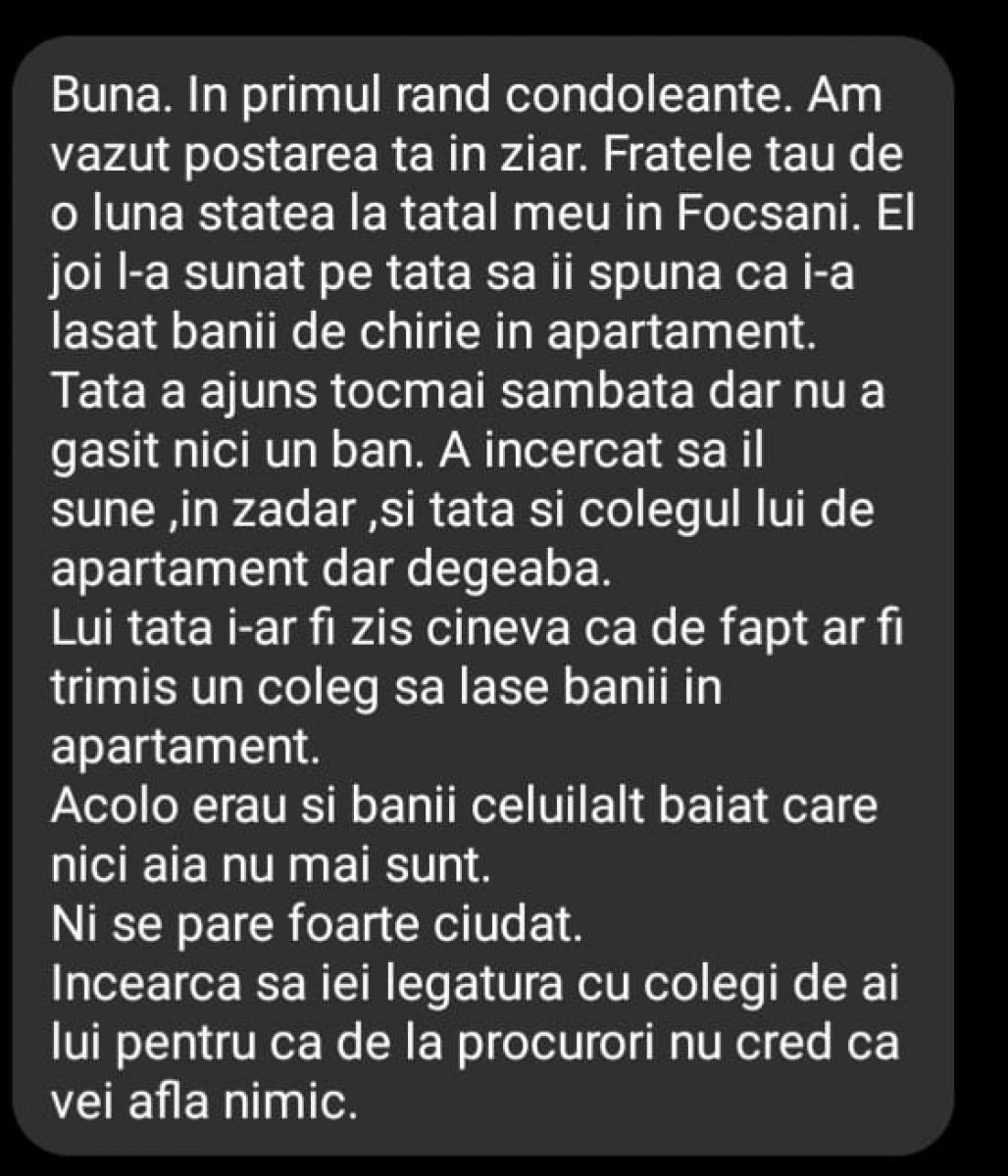 ”În primul rând condoleanțe. Am văzut postarea ta în ziar. Fratele tău de o lună stătea la tatăl meu în Focșani. El joi l-a sunat pe tata să îi spună că i-a lăsat banii de chirie în apartament. Tata a ajuns tocmai sâmbătă, dar nu a găsit nici un ban. A încercat să îl sune, în zadar, și tata și colegul lui de apartament, dar degeaba. Lui tata i-ar fi zis cineva că de fapt ar fi trimis un coleg să lase banii în apartament. Acolo erau și banii celuilalt băiat care nici ăia nu mai sunt. Ni se pare foarte ciudat. Încearcă să iei legătura cu colegi de-ai lui, pentru că de la procurori nu cred că vei afla nimic”.