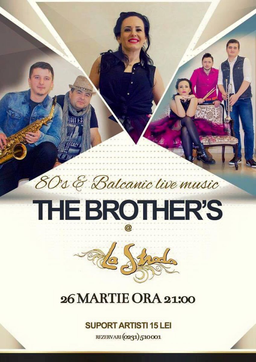 La Strada, localul de pe Pietonalul Unirii, din municipiul Botoșani, se transformă în ring de dans, din nou cu muzică live, hituri din anii 80 și muzică balcanică. Trupa The Brothers va încinge atmosfera și promite o petrecere de neuitat. Așadar, cei care doresc să se destindă în compania artiștilor, la cel mai hot eveniment din oraș, trebuie să vină pregătiți cu pantofii de dans.