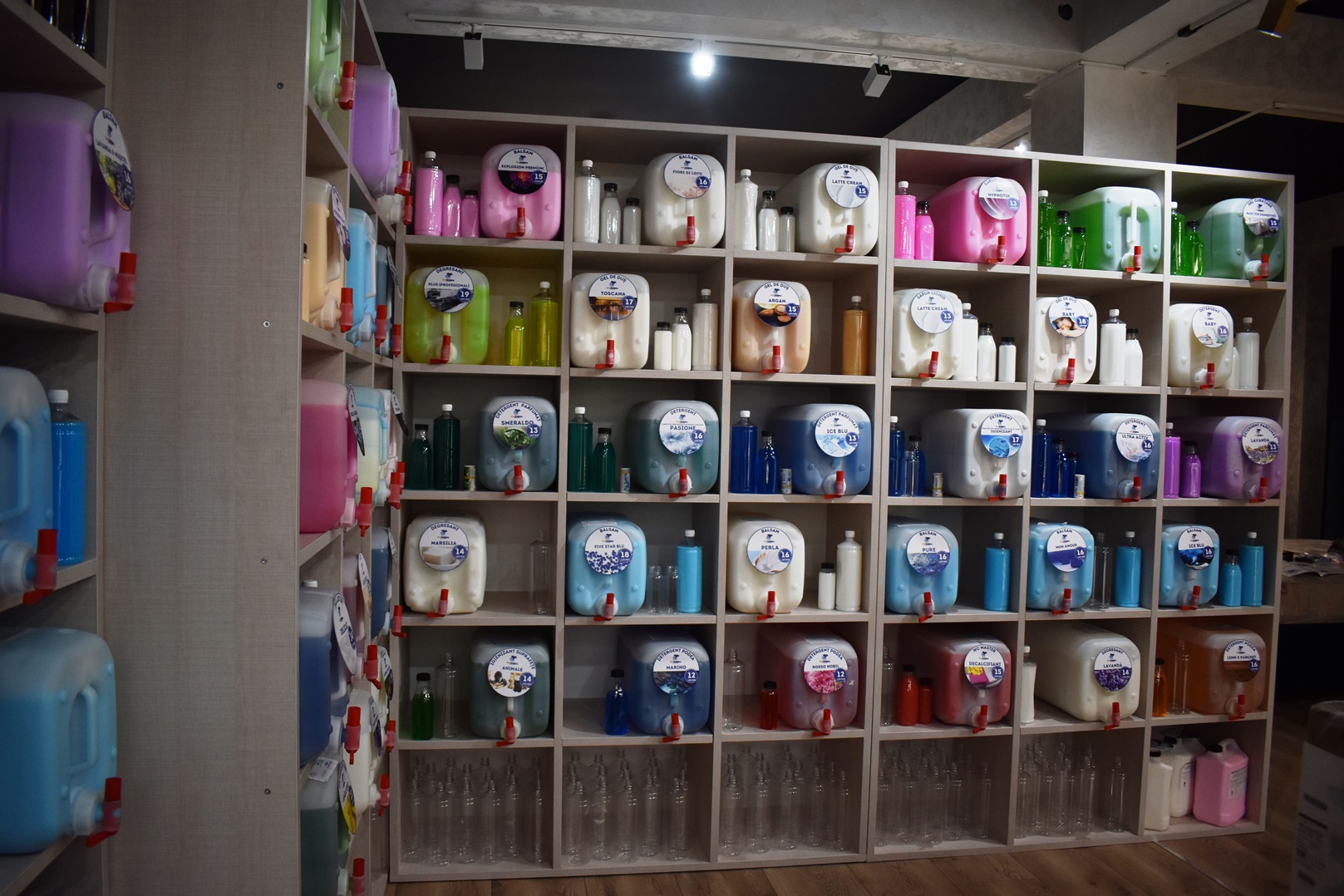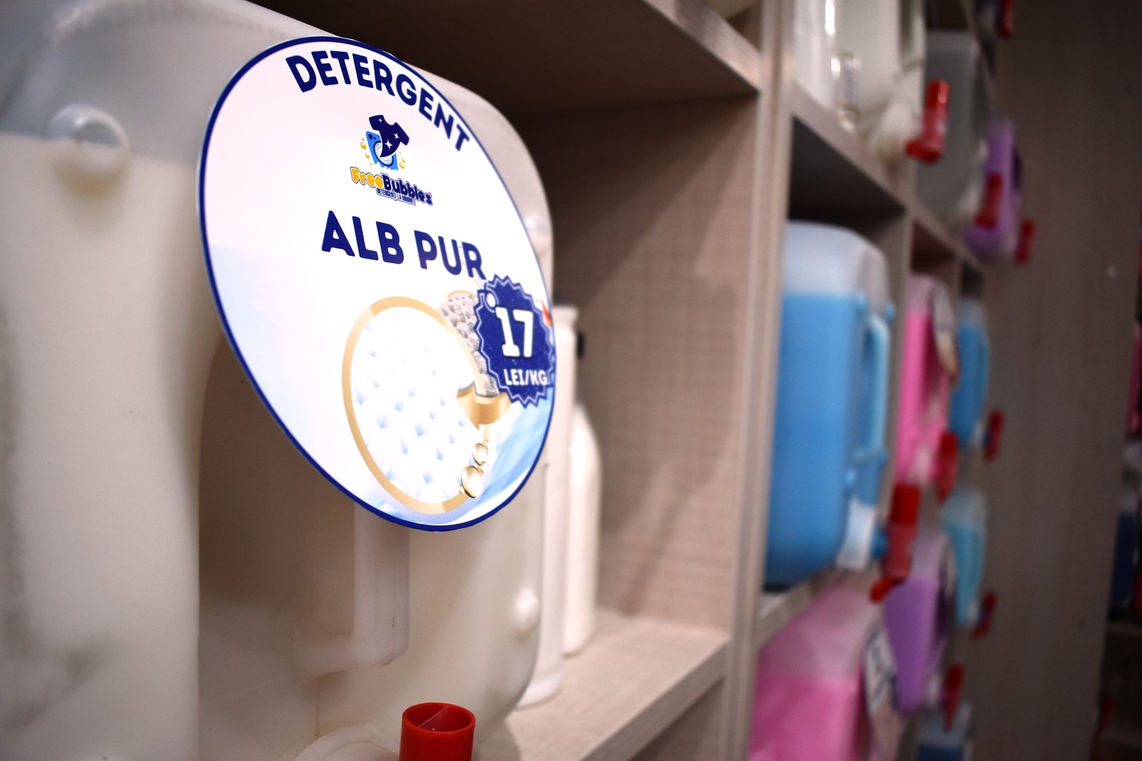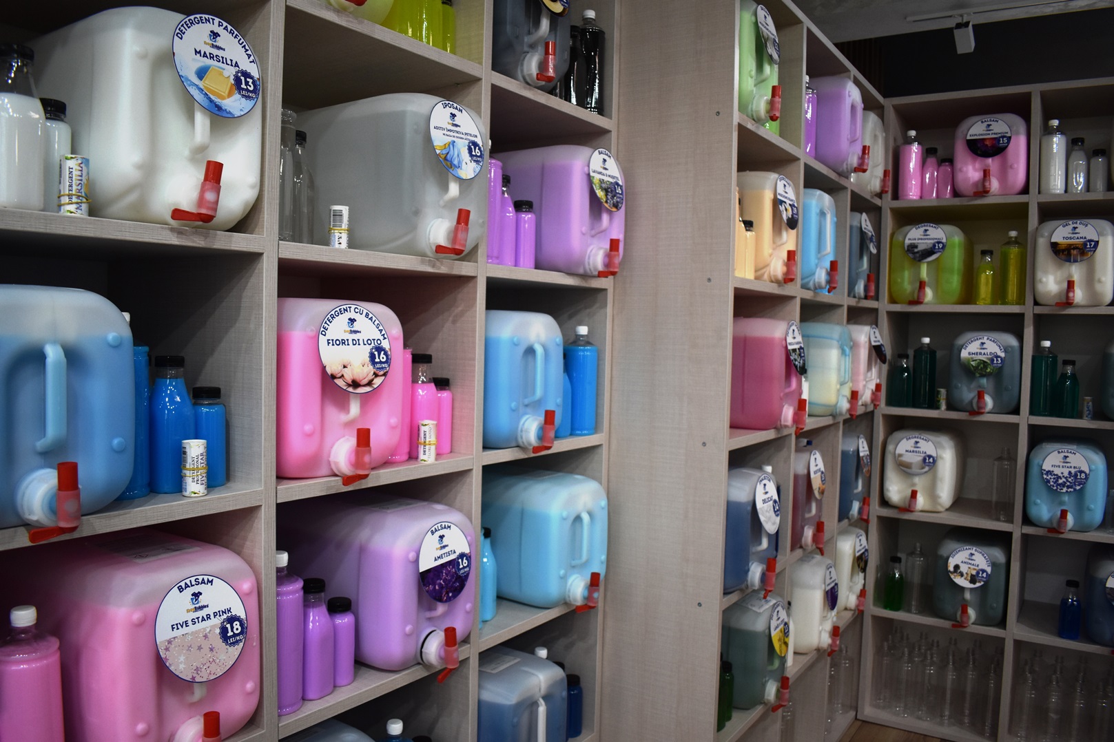 Spre deosebire de celelalte magazine de uz casnic, aici detergenții sunt depozitați în rezervoare cu robinet, iar cumpărătorii își pot lua singuri oricât doresc.