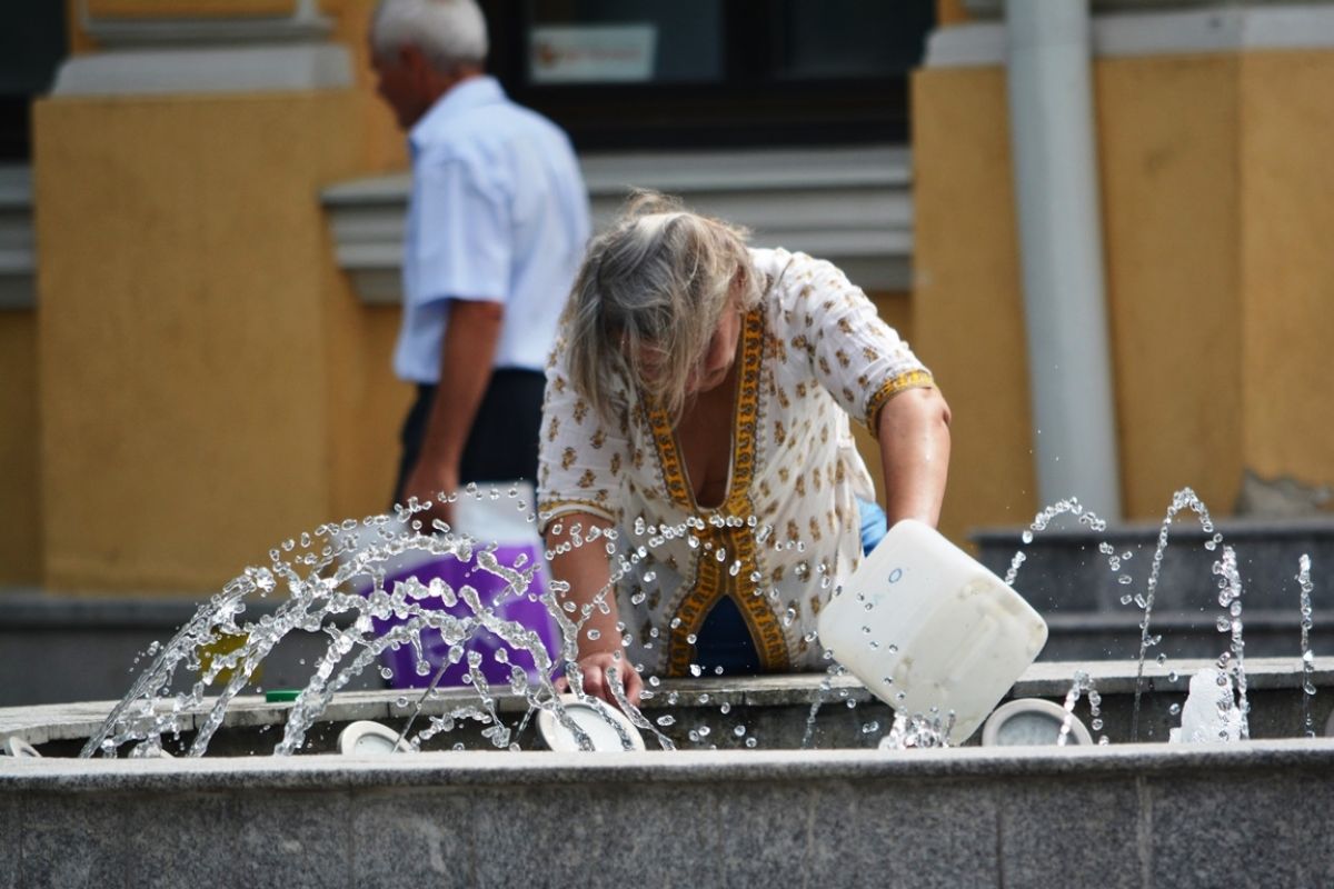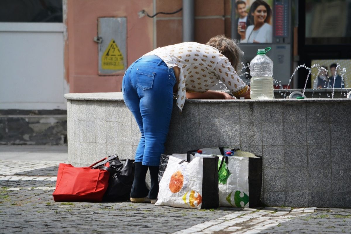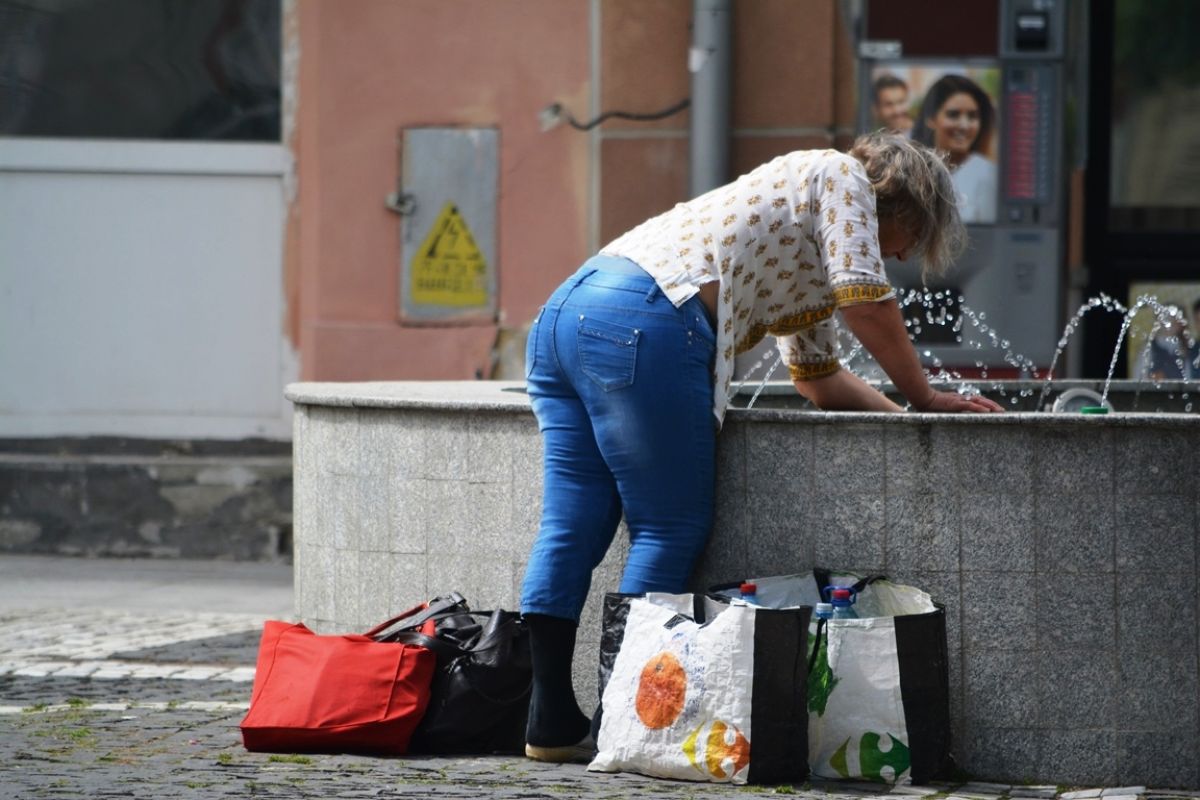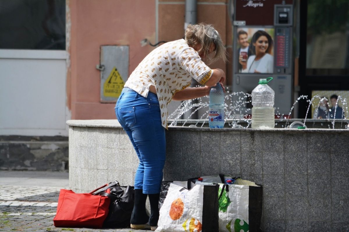 Botoșani, România, solstițiul de vară 2016... Pe la 11 și un sfert în Centrul Vechi o femeie își umple tacticoasă un bidon de apă. Sursa? Fântâna arteziană de lângă Biserica Uspenia.