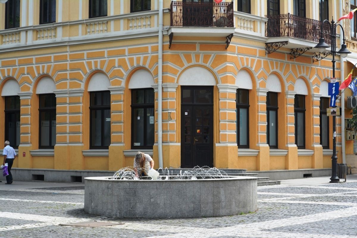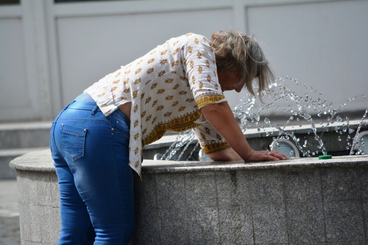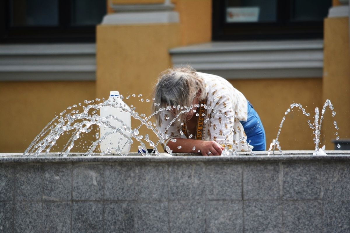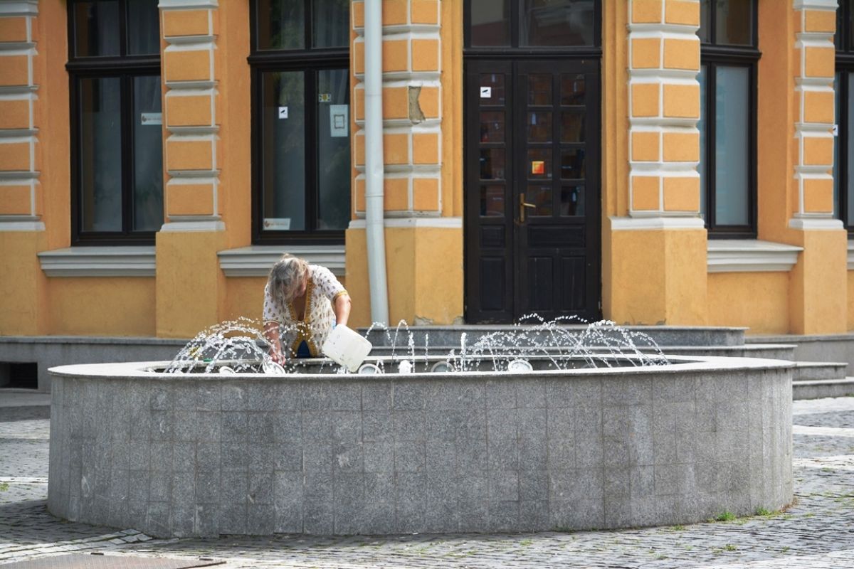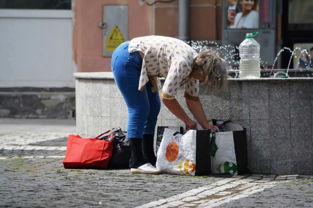 Botoșani, România, solstițiul de vară 2016... Pe la 11 și un sfert în Centrul Vechi o femeie își umple tacticoasă un bidon de apă. Sursa? Fântâna arteziană de lângă Biserica Uspenia.