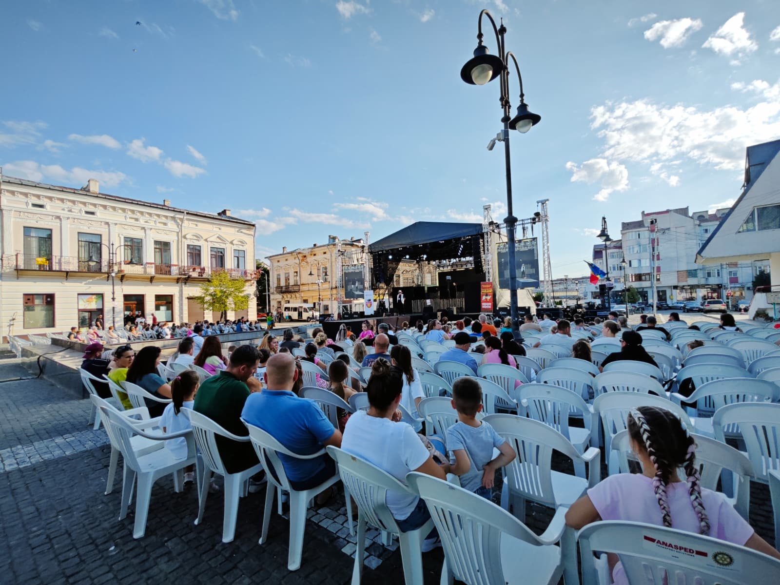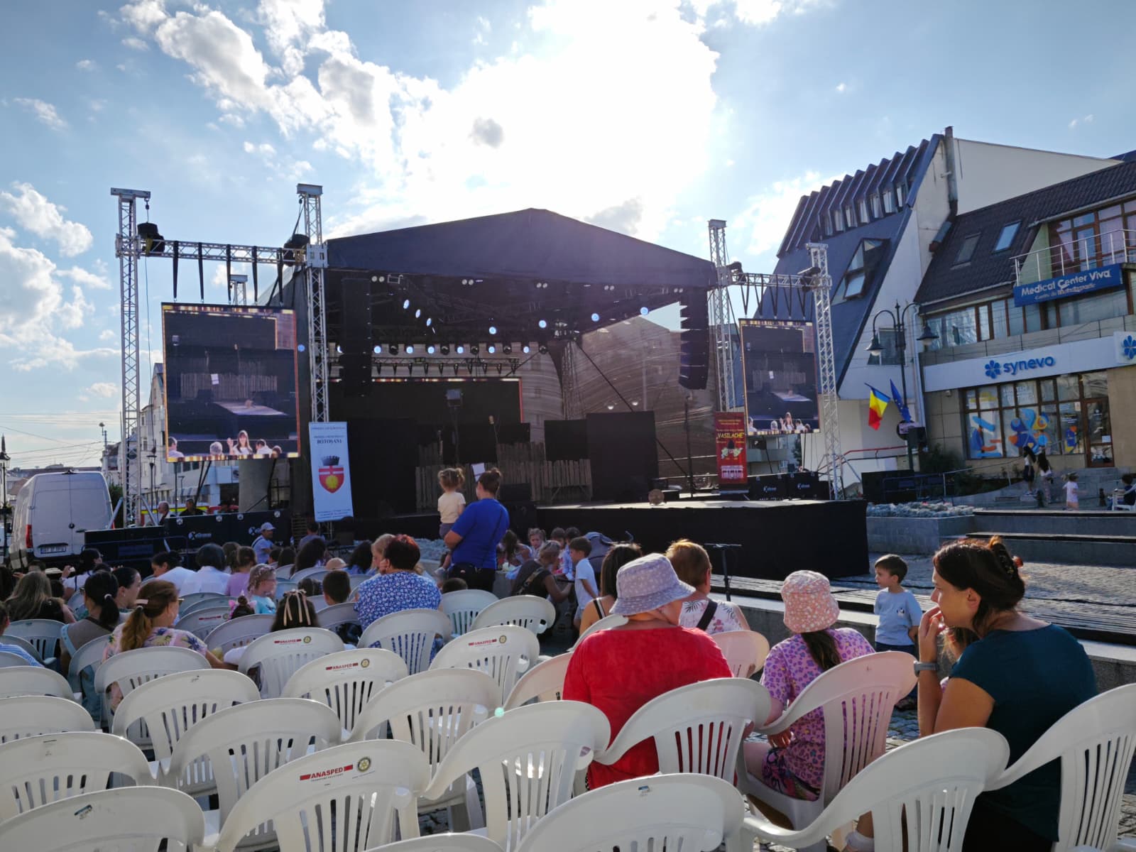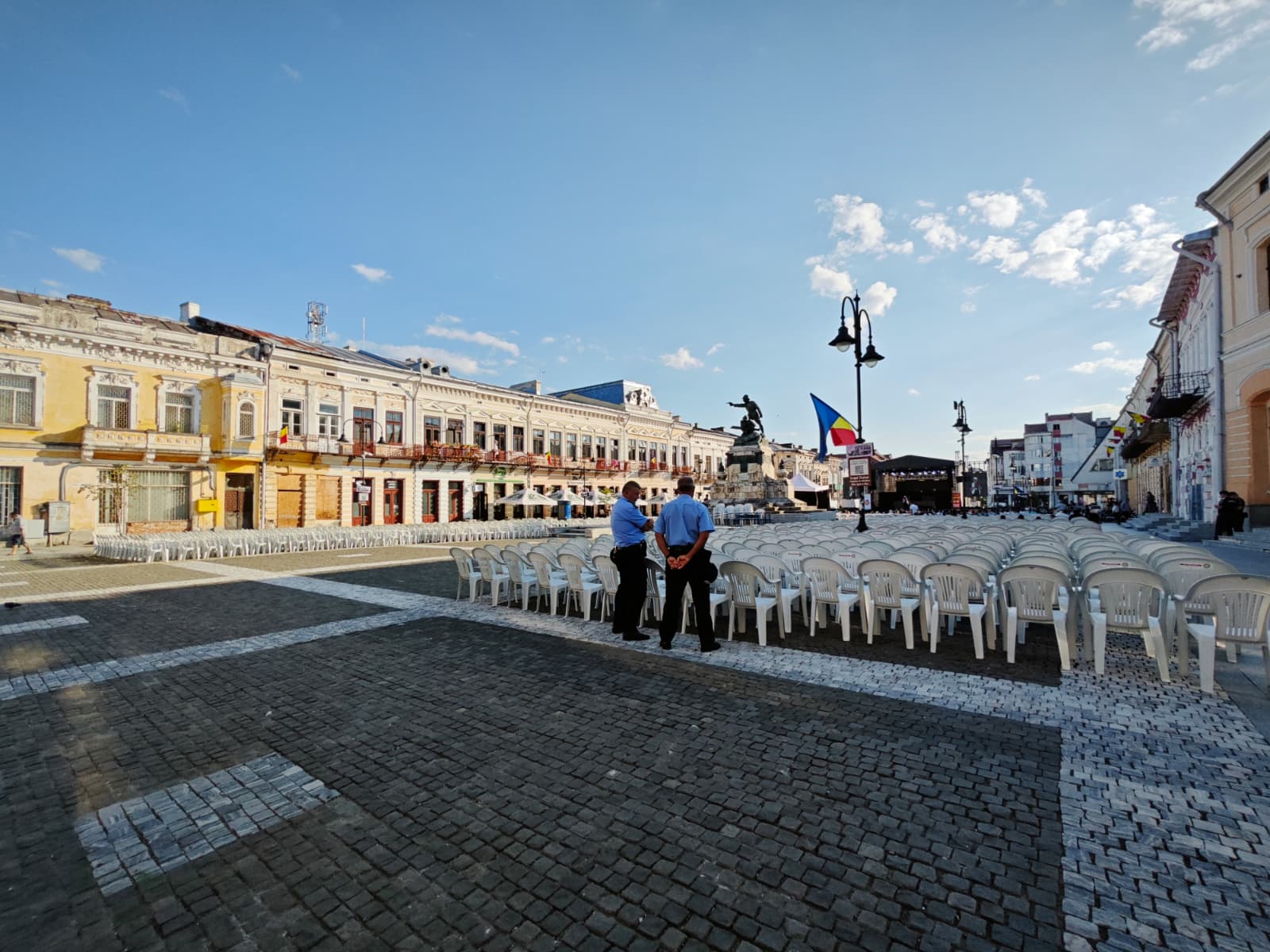 În zonă au fost amplasate scaune albe pe care vor lua loc persoanele care vor merge pentru spectacole.
