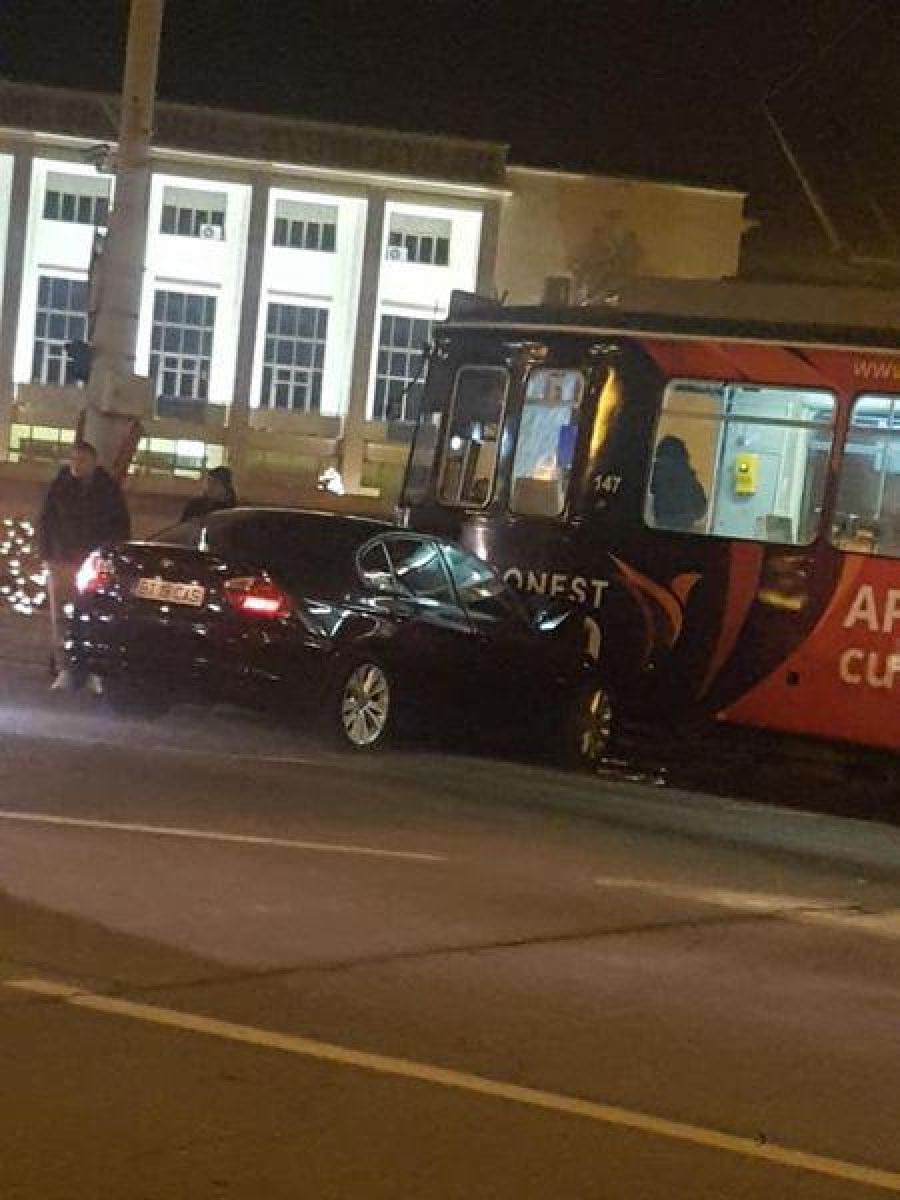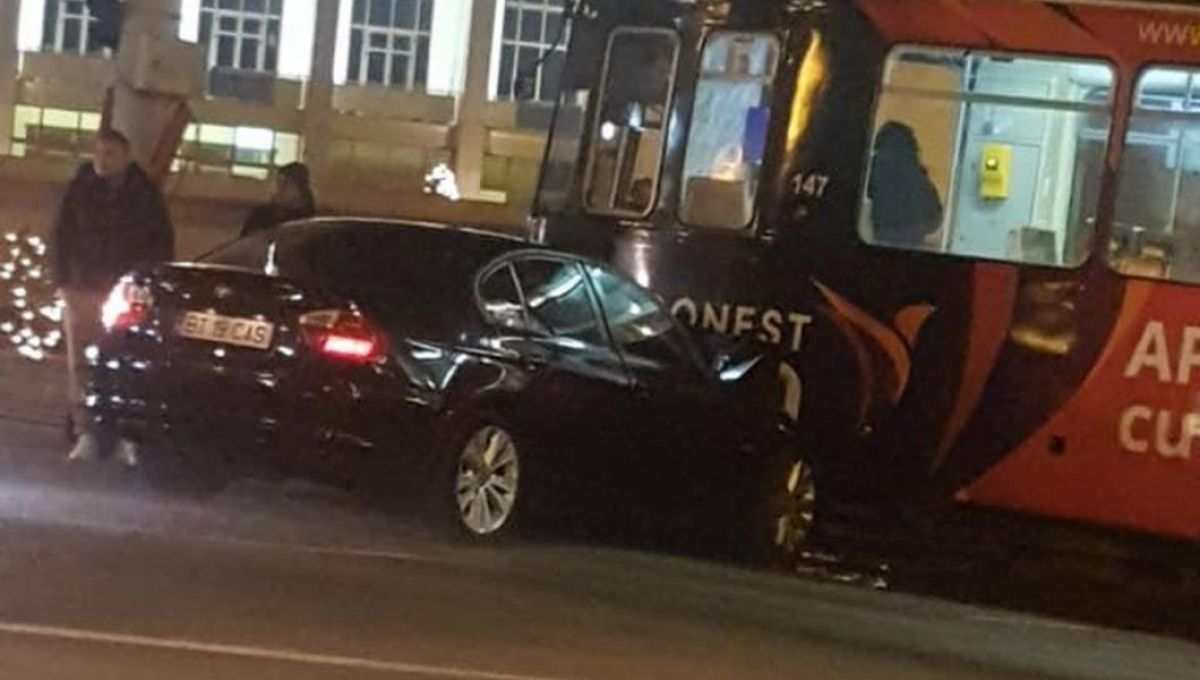 Un șofer care conducea un BMW cu numere de Botoșani a intrat perpendicular într-un tramvai care urca spre Copou, în fața Casei Studenților din Iași. Din imagine se vede că autoturismul de lux a fost destul de avariat.