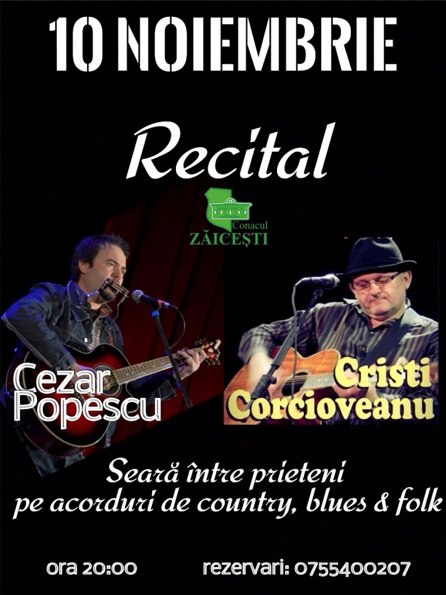 Vineri 10 noiembrie, orele 20:00, Cezar Popescu şi Cristi Corcioveanu sunt invitaţi în recital la Conacul Zăiceşti. Cei doi cantautori ne propun o seară pe acorduri de country-folk-blues, cu aromă de toamnă târzie.
