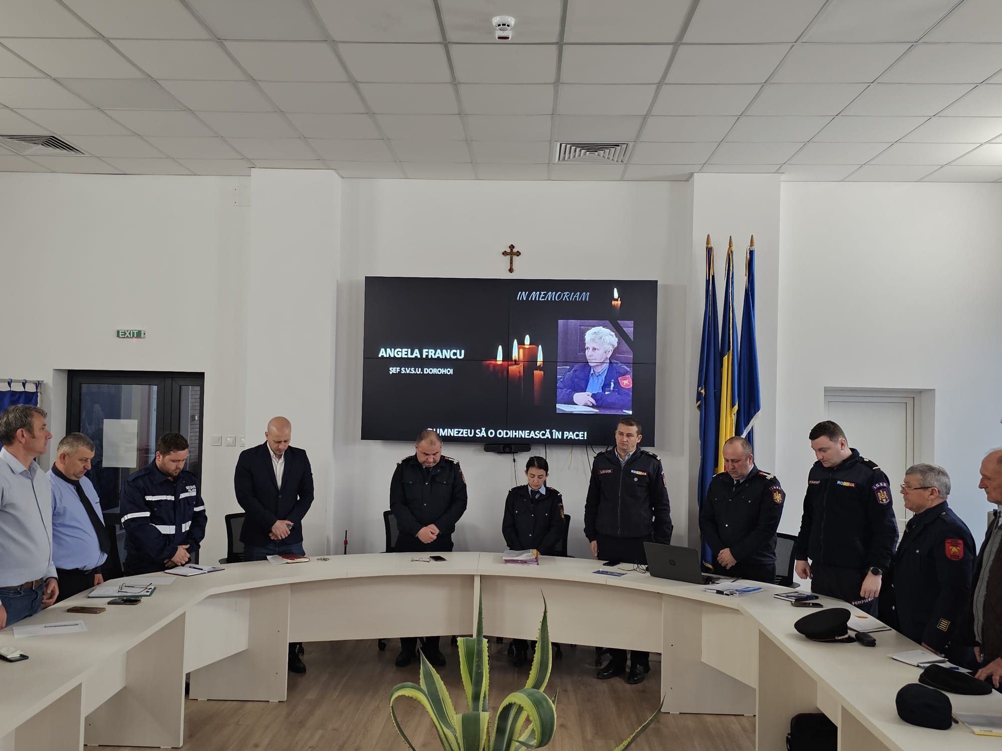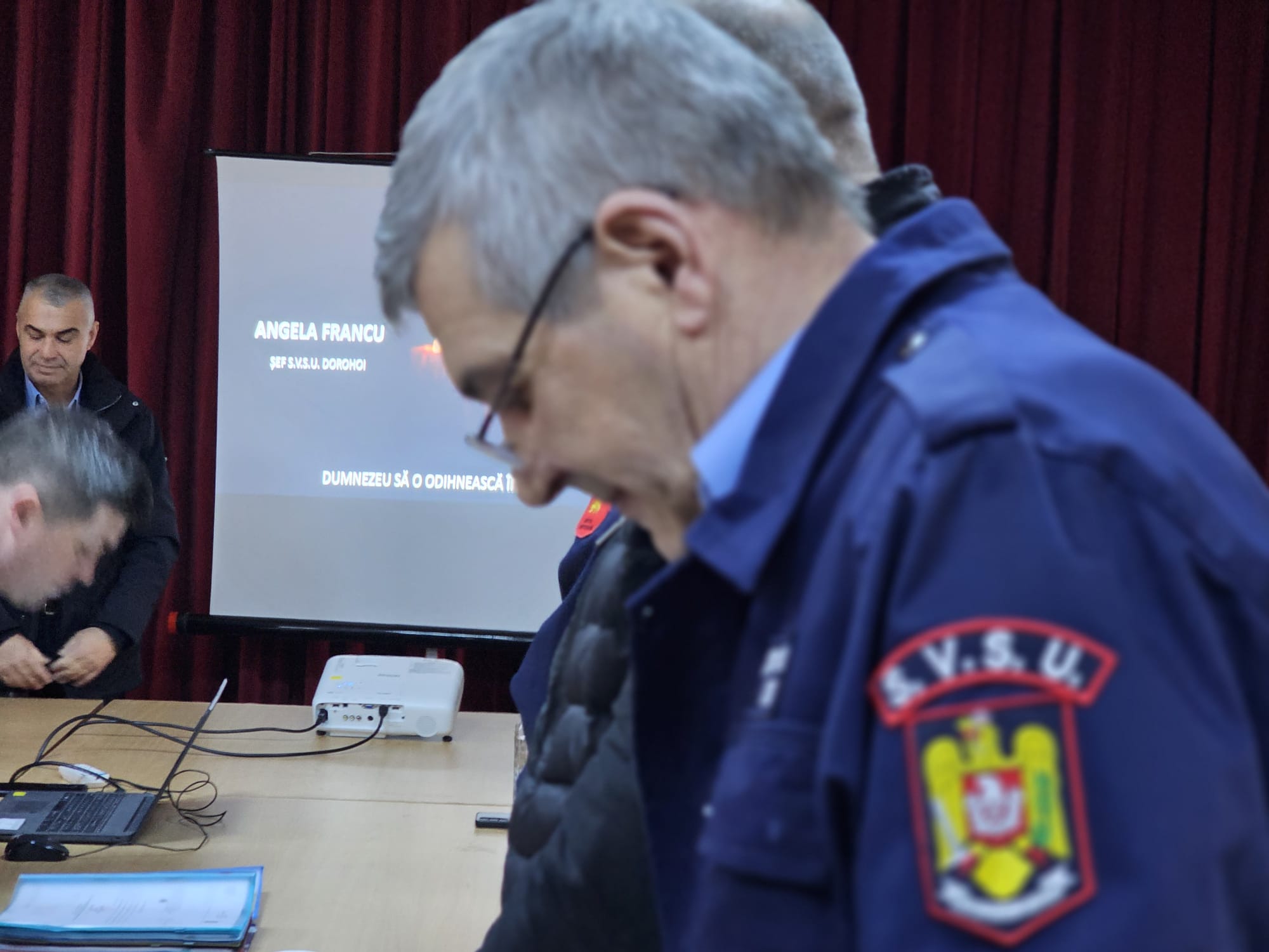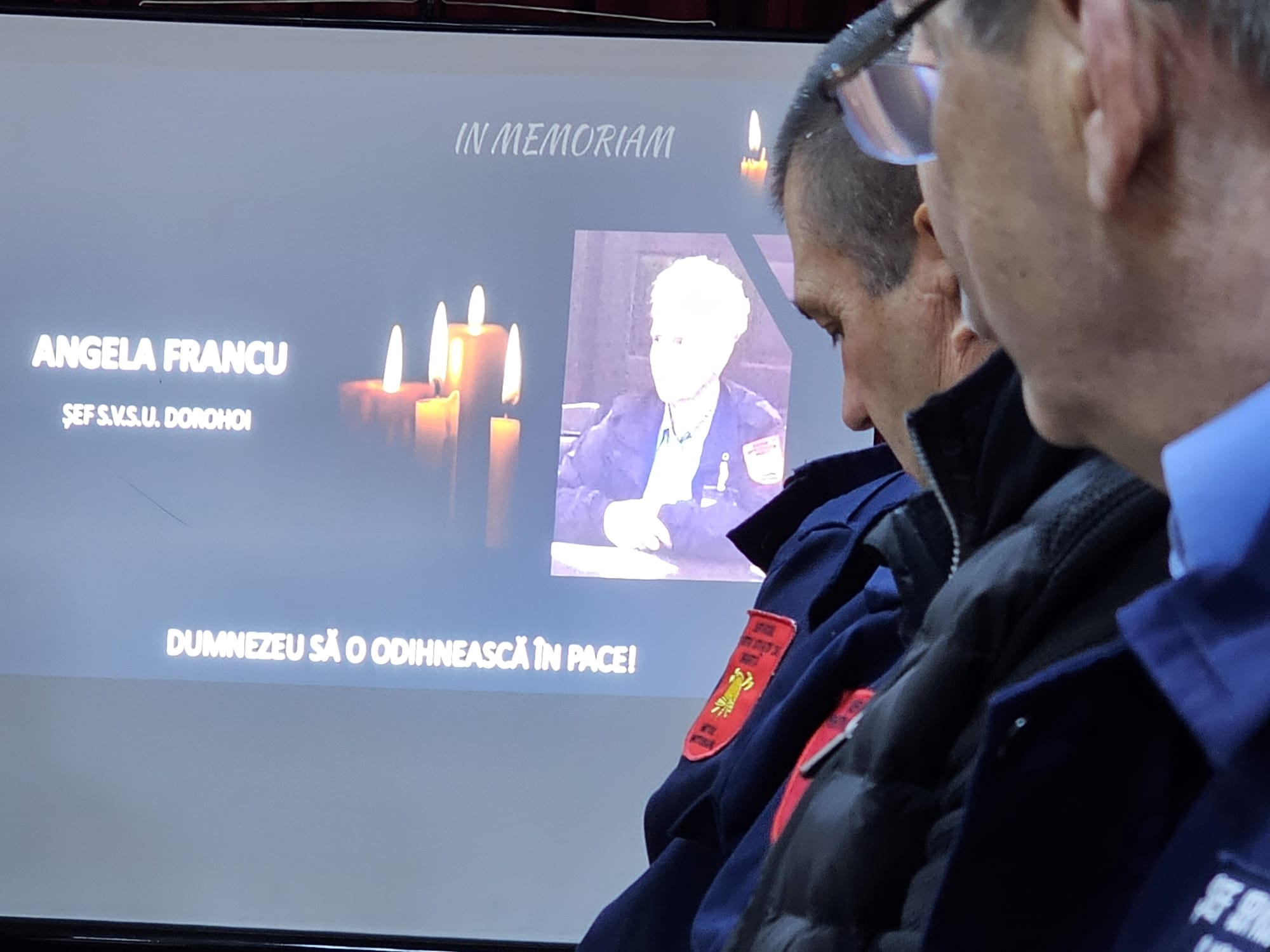 În deschidere, s-a ținut un moment de reculegere pentru Angela Francu, șefa Serviciului Voluntar pentru Situații de Urgență Dorohoi, care a încetat din viață la începutul lunii martie.