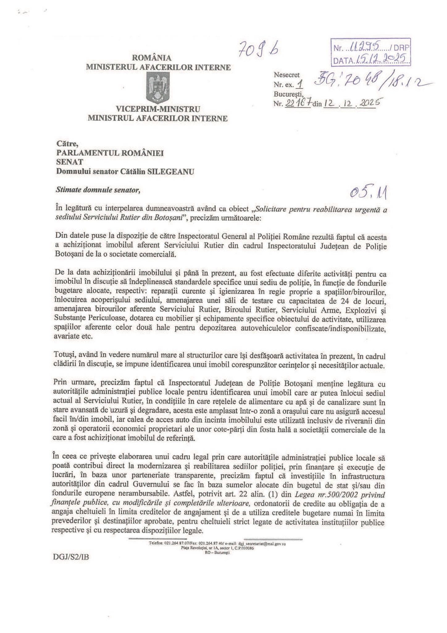 Ministerul Afacerilor Interne (MAI) a reacționat prompt la interpelarea depusă de senatorul Cătălin Silegeanu privind starea sediului în care funcționează Serviciul Rutier și Serviciul Arme, Explozivi și Substanțe Periculoase din cadrul IPJ Botoșani, anunțând că se află în derulare proceduri pentru identificarea unui nou spațiu.