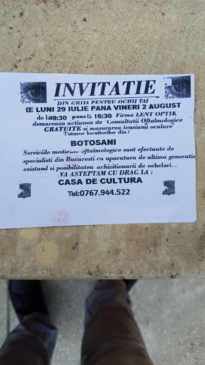 „Aparatura medicala se operează doar in spatii autorizate de Ministerul Sănătății, nu în orice colț de strada.2.Consultatii oftalmologice se pot efectua doar de medicul oftalmolog, iar aceste persoane nu au aceasta calitate. 3.Iar ochelarii conform legii 176/2000 sunt considerați dispozitive medicale, iar vânzarea lor este strict reglementata. Pe consumator ce lege îl apară de aceste minciuni? Vin, pleacă și lasă botoșănenii păcăliți!”,