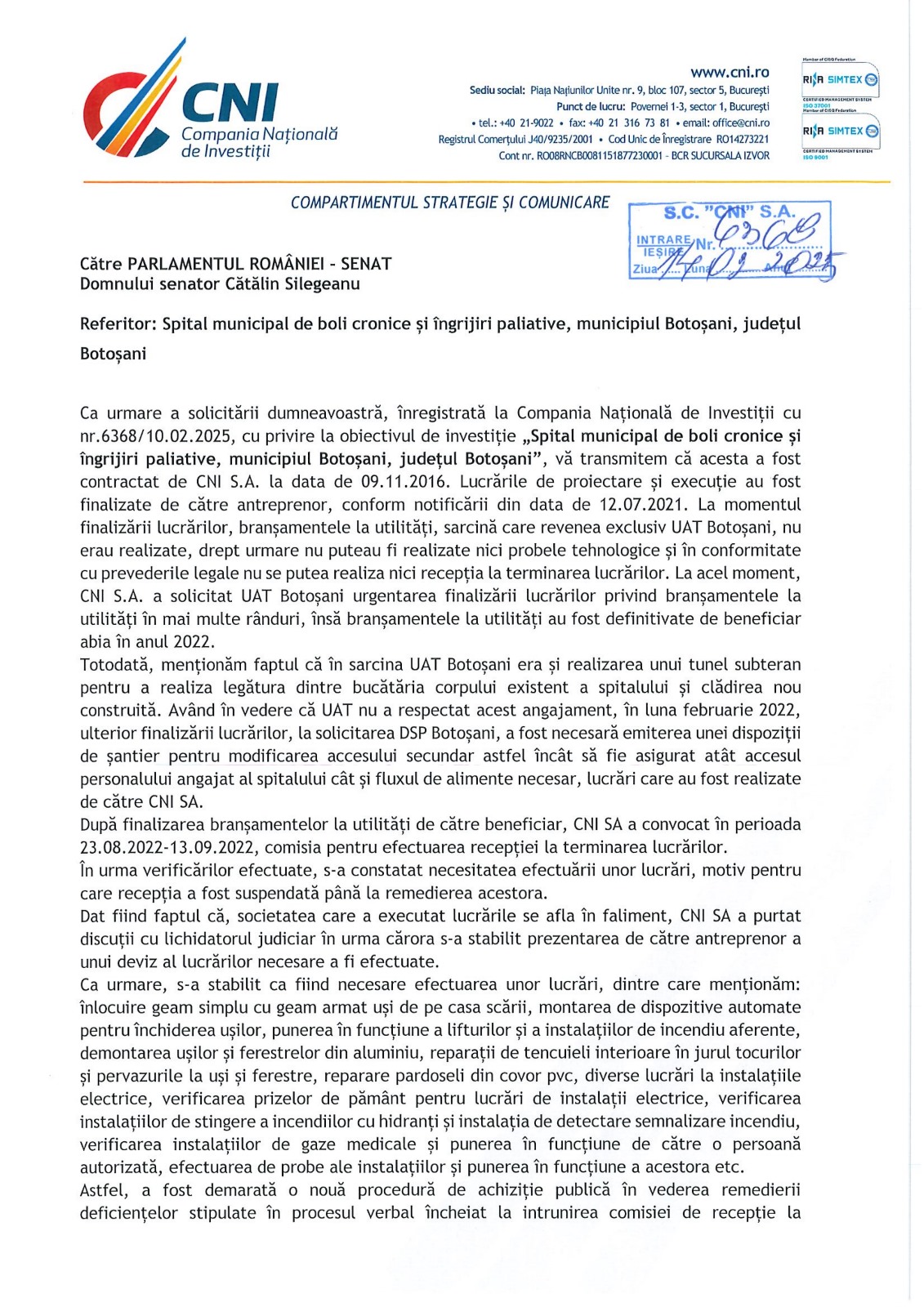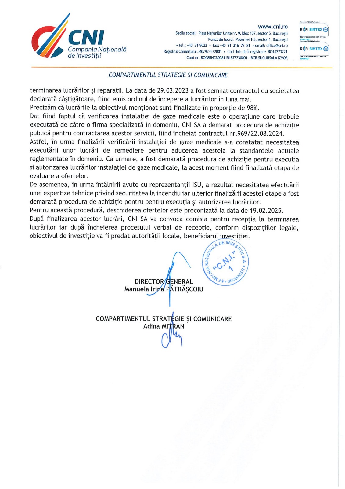 Cătălin Silegeanu a subliniat că a primit o adresă oficială de la CNI referitoare la stadiul actual al proiectului și a programat întâlniri cu reprezentanții CNI și ai autorităților locale pentru a identifica soluții rapide și eficiente pentru finalizarea lucrărilor.