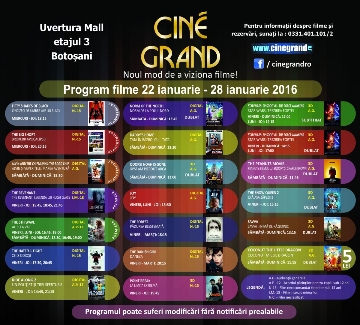 În perioada 22-28 ianuarie 2016, reprezentanții Cine Grand Botoșani au pregătit pentru iubitorii de filme trei avanpremiere, care vor fi rulate pe marile ecrane. Așadar, cei care vor să scape de stresul cotidian sunt invitați la o terapie de…râs.