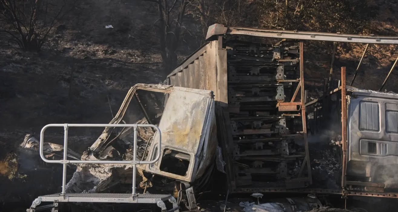 În urma impactului, vehiculul în care se aflau cei doi a ars complet. Flăcările s-au extins rapid și în afara carosabilului, afectând aproximativ jumătate de hectar de vegetație și avariind parțial și celălalt camion implicat.