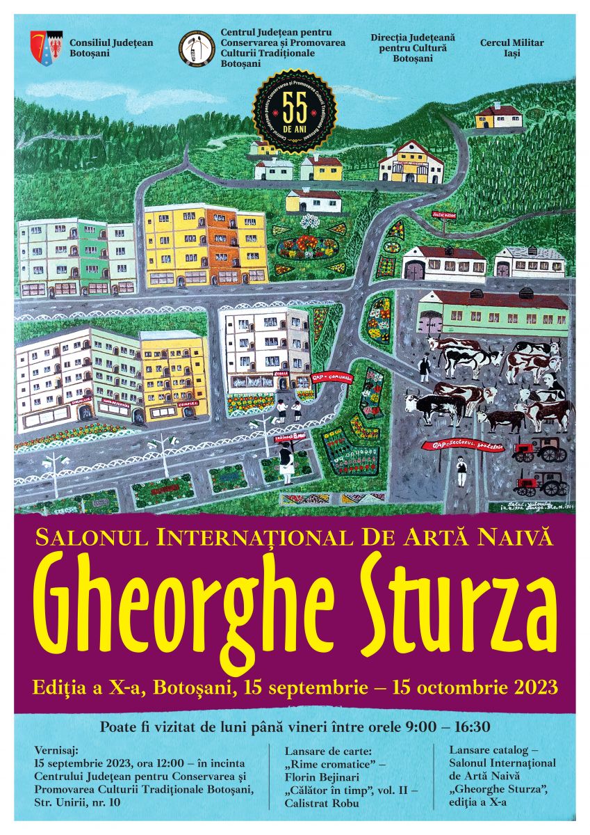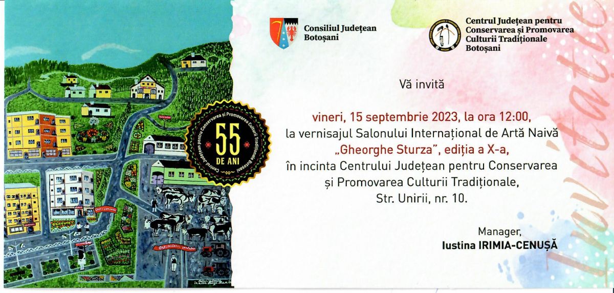 În perioada 15 septembrie - 15 octombrie 2023, Centrul Judeţean pentru Conservarea şi Promovarea Culturii Tradiţionale Botoşani, instituție publică de cultură aflată în subordinea Consiliului Județean, având parteneri Direcția Județeană pentru Cultură Botoşani și Cercul Militar Iași, organizează Salonul Internațional de Artă Naivă „Gheorghe Sturza”, ediţia a X-a, al cărui vernisaj va avea loc vineri, 15 septembrie 2023, ora 12:00, în incinta Centrului Județean pentru Conservarea și Promovarea Culturii Tradiționale Botoșani.