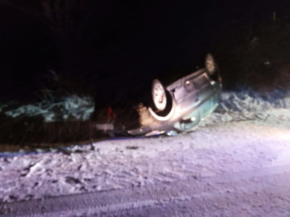 Din cauza carosabilului alunecos, acoperit cu zăpadă, șoferul unui Volkswagen Sharan a pierdut controlul asupra automobilului, acesta a părăsit șoseaua și s-a răsturnat, oprindu-se pe cupolă.
