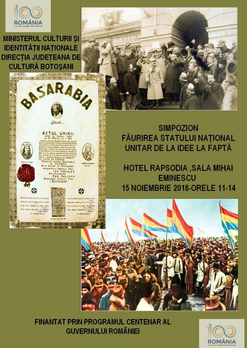 Direcţia Judeţeană pentru cultură Botoşani organizează Simpozionul dedicat Centenarului Marii Uniri cu tema Făurirea statului naţional unitar de idee la faptă, finanţat prin Programul Centenar al Guvernului României.