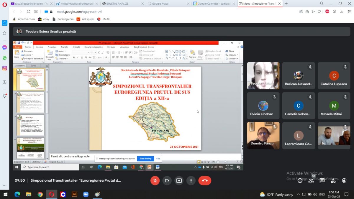 Manifestarea științifică organizată de filiala Botoșani a SGR, condusă de prof. Mihai Poclid și inspector școlar prof.dr. Teodora Estera Ursulică s-a desfășurat în format online și a beneficiat de invitați de renume: prof. univ dr. Corneliu Iațu – președintele SGR România, prof. dr. cercetător științific Octavin Mândruț, prof. dr. Ada Alexandrina Macovei – Inspector Școlar General al ISJ Botoșani și prof. Ana Maria Loghin - Inspector Școlar General Adjunct.